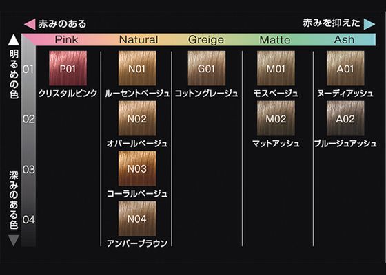 「高感度なヘアサロンで人気の色からピックアップしたラインアップ。明るめであざやかな色みの品揃えがいいですね。黒髪はもちろん、気になり始めたチラッと白髪までキレイに染まるのもありがたいです♪」