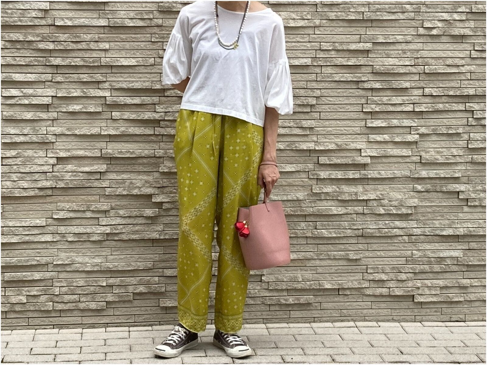 柄パンツは、リラックス感があって涼し気。加えて比較的ウエストゴムのものが多いのに、オシャレして見えるので暑い日に手に取りたくなる夏服のひとつとなっています。柄パンツをはくときに、着る頻度が高いのが白Tシャツ。顔まわりが明るくなるし、柄パンツの色を問わず万能だと感じます。