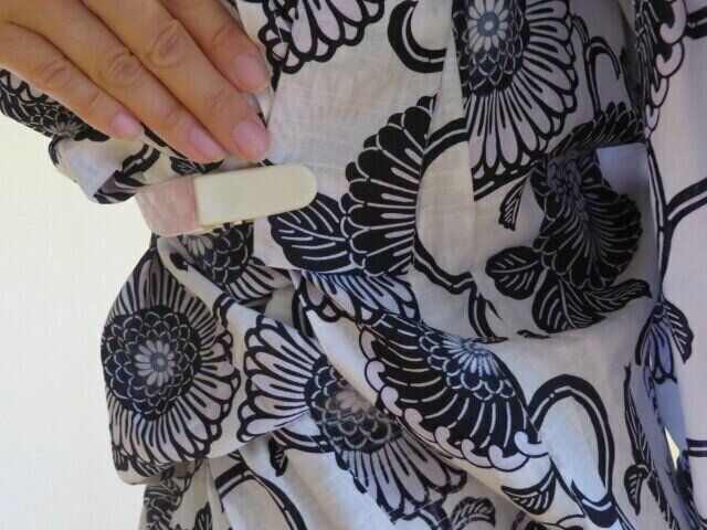 右側の生地がだぶつく場合はふところに右手を入れてたるんだ生地をつまんで重ねてしまうといいです(この処理をしなくても着られるようですが)。