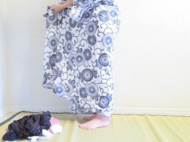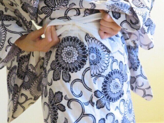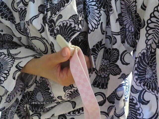 普通に袖を通しただけでは引きずってしまうので、持ち上げて腰ひもで固定する必要があります。
