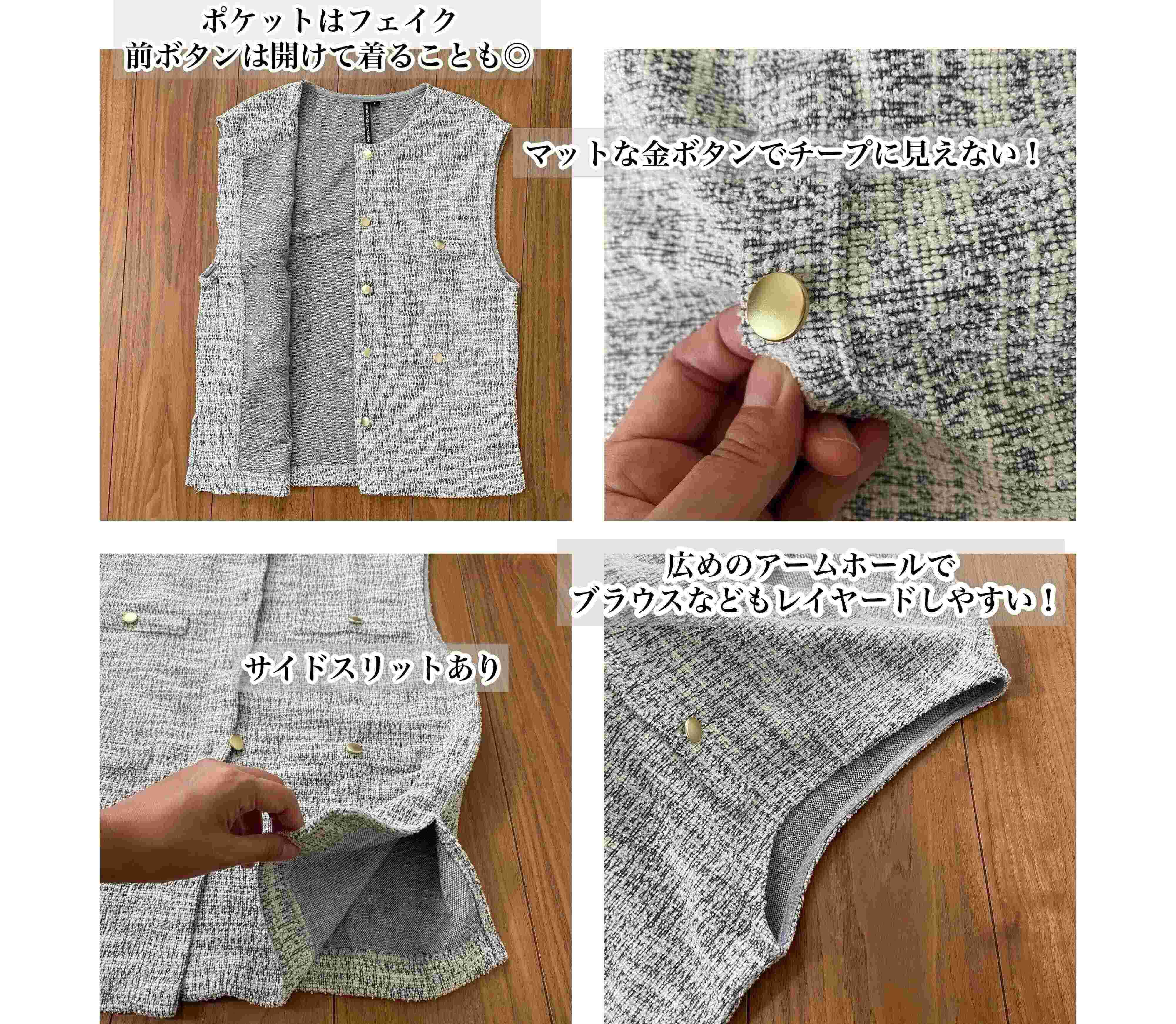 前身頃に四つあるポケットはどれもフェイクですが、縦に並んだボタンは外してジレのように着ることも可能です。