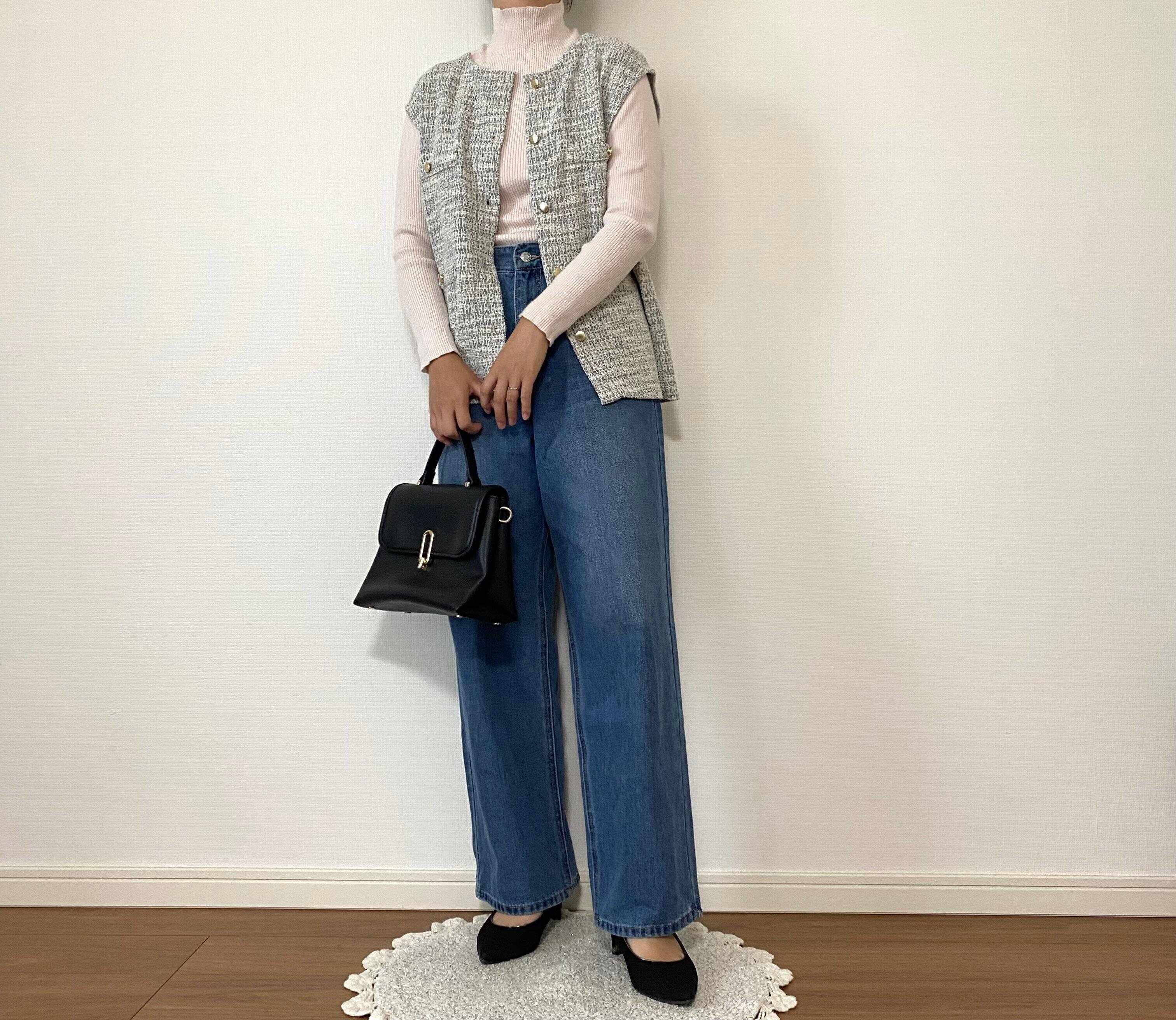 綺麗めなイメージのツイードアイテムを、デニムと合わせてカジュアルに着るのもトレンド感のあるコーディネートになりそうです。