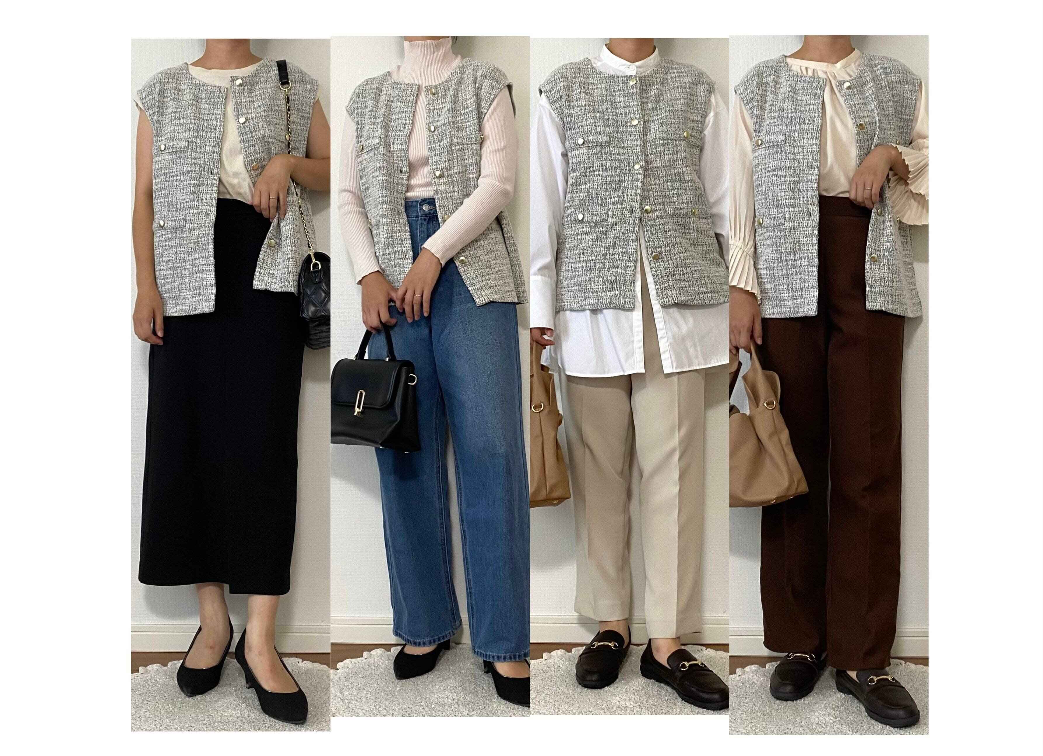 ツイード生地ですが薄く軽いのでまだ暑さが残る時期からでもレイヤードして、コーデに秋感をプラスできそう。