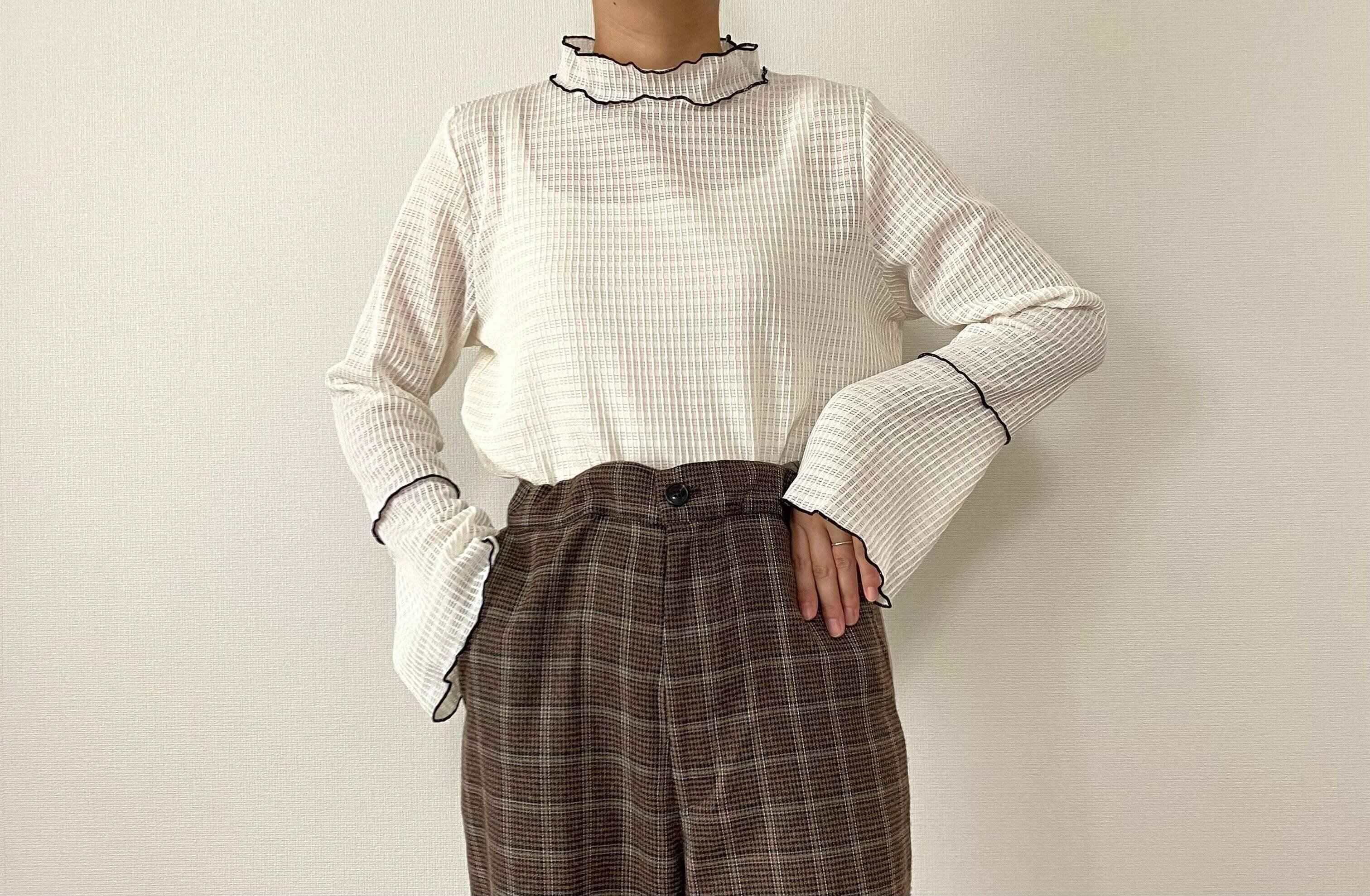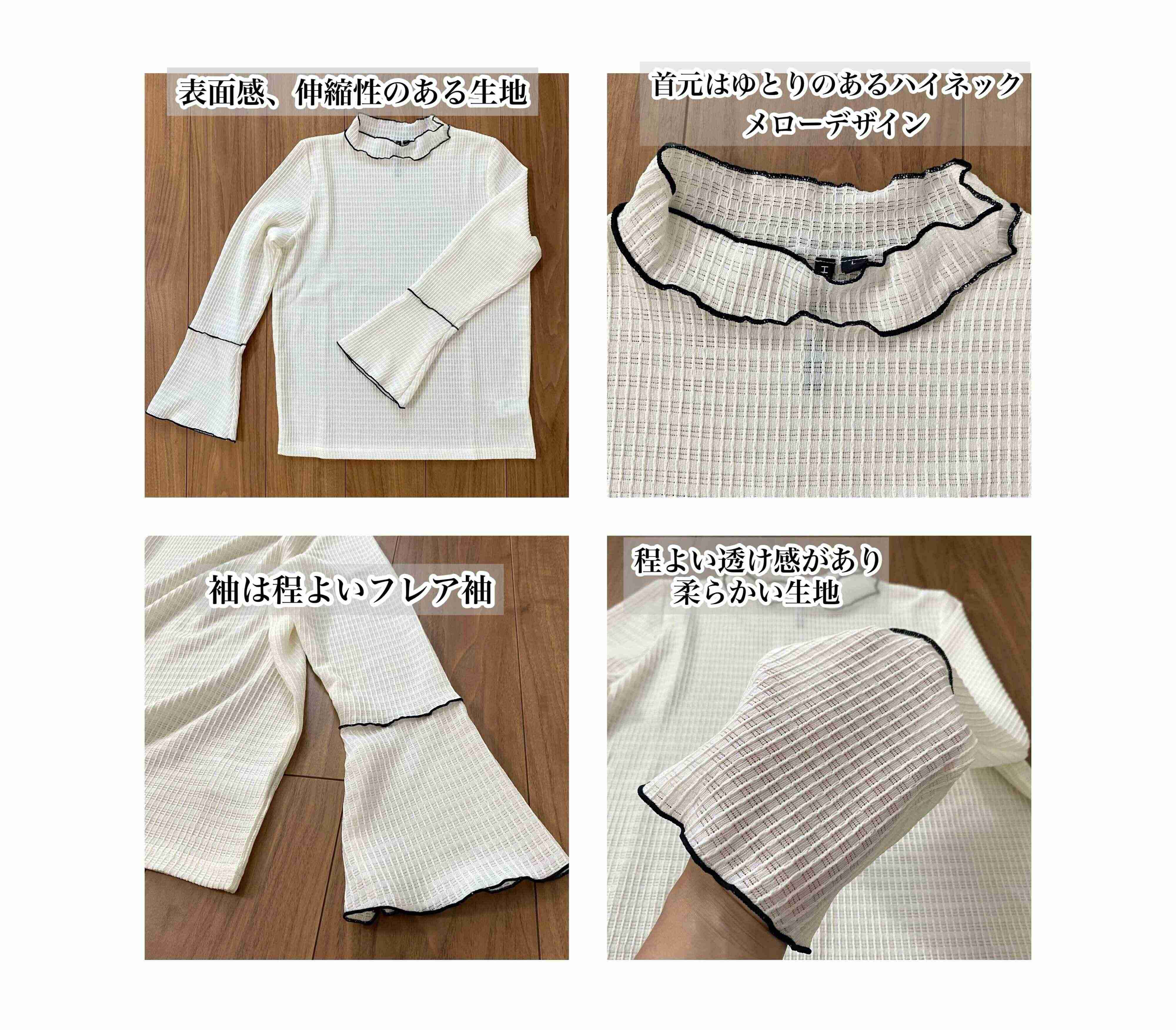 首元と袖に施されたメローデザインはバイカラーなので存在感があり、袖もトレンドのフレア袖で1枚で着ても着映えする優秀アイテムです。