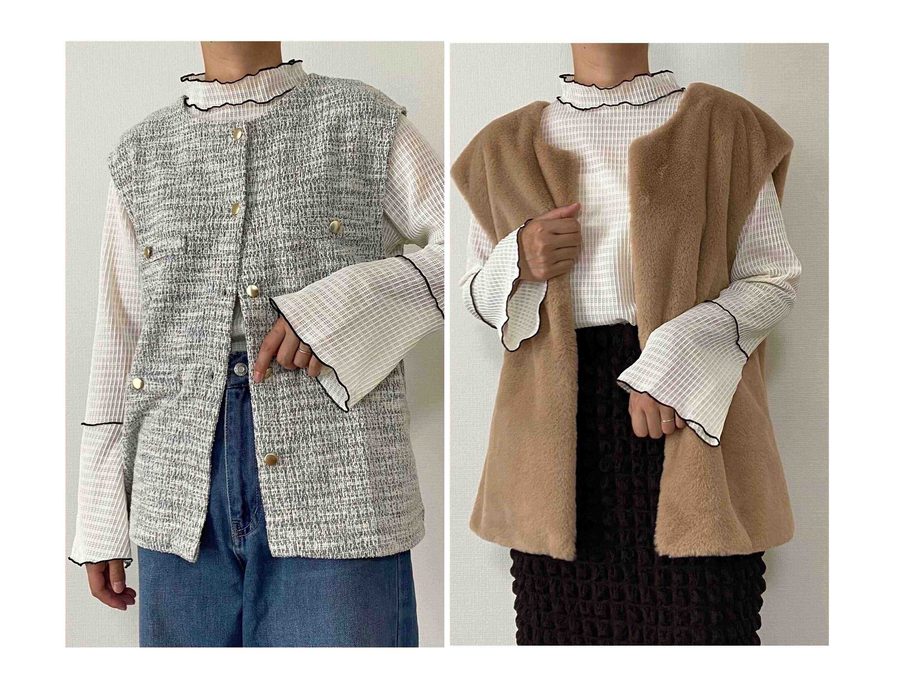 首元と袖にデザインがあるとベストとレイヤードしたときもメローがポイントになってかわいさ抜群!