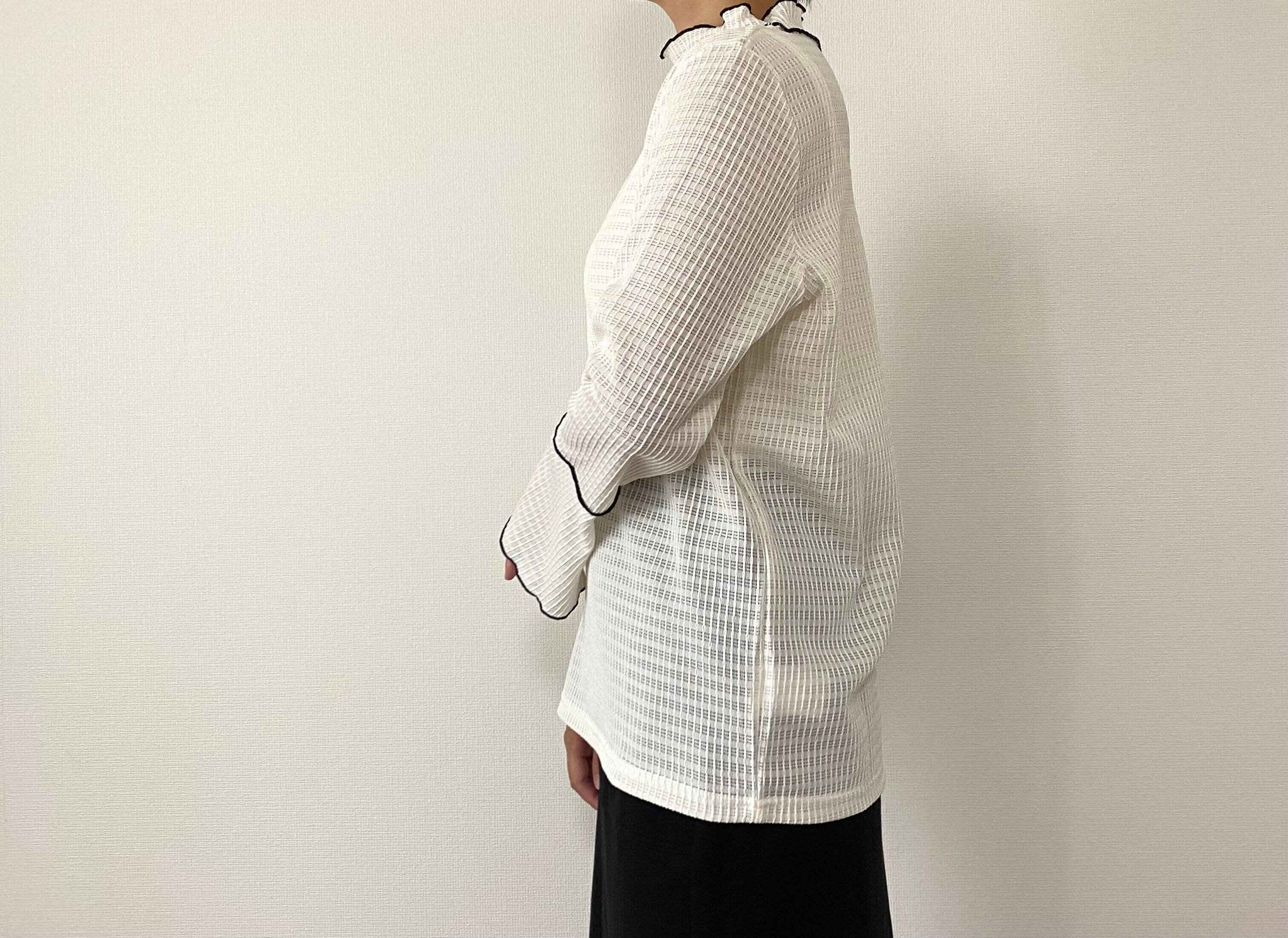裾はお尻が隠れるくらいの長さがあり、袖もフレアなので身体のラインがでにくく、透け感はありますが大人の女性も抵抗がなく着られそうなサイズ感です。