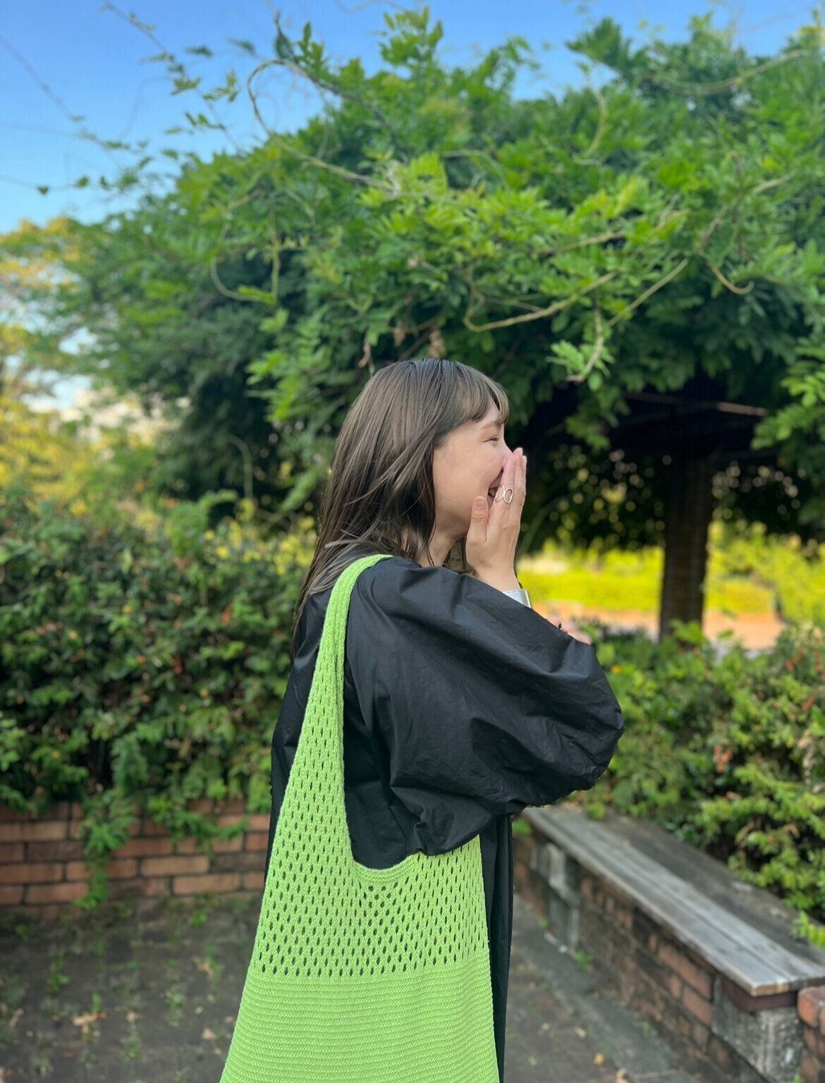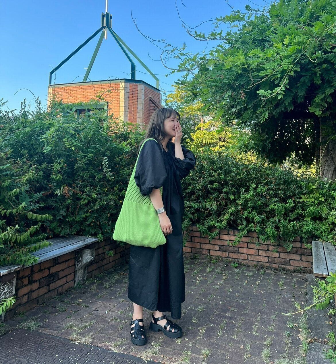 ニット素材のバッグを合わせています。デザイン性のあるワンピースは、それだけで存在感がありお洒落度もアップします。