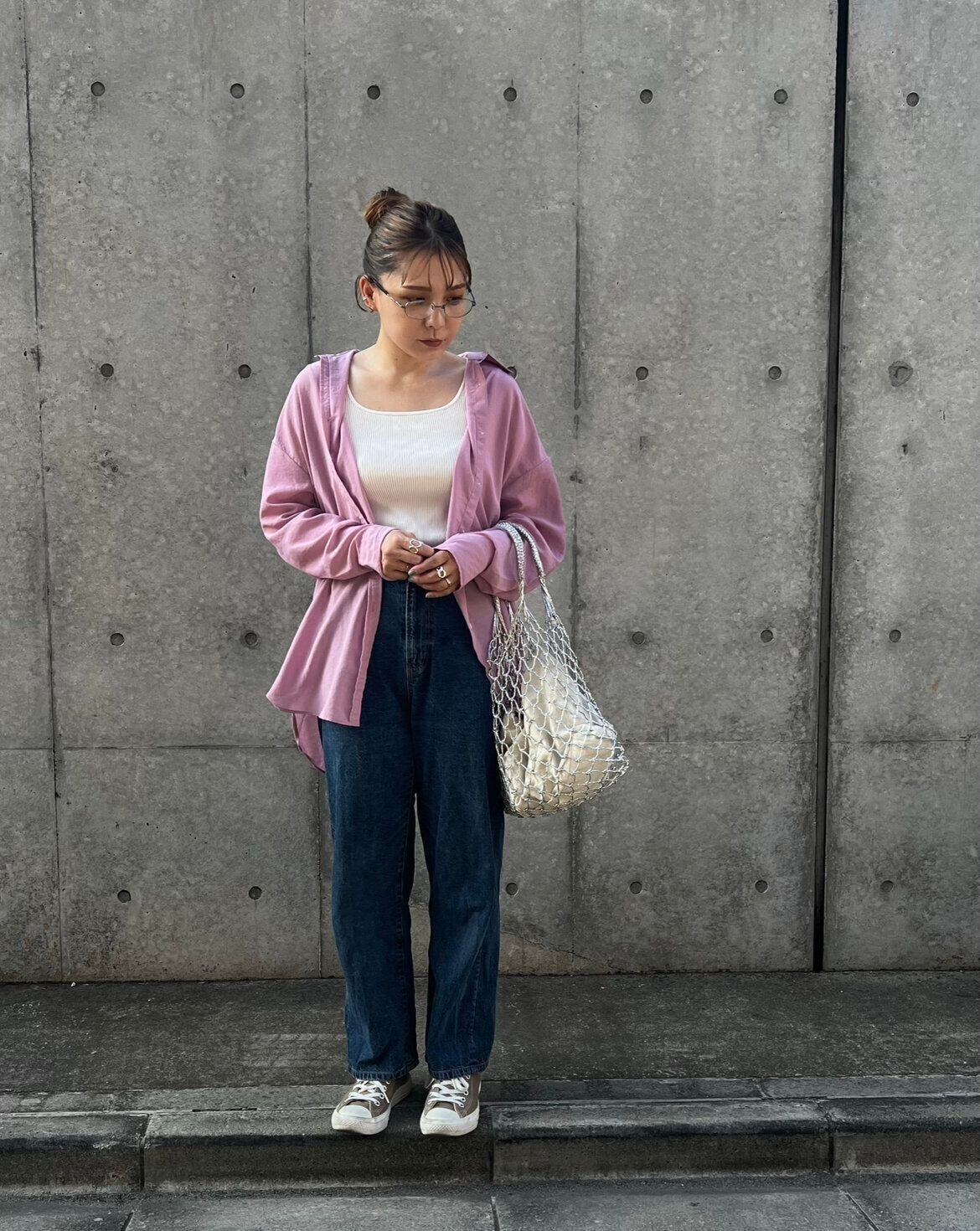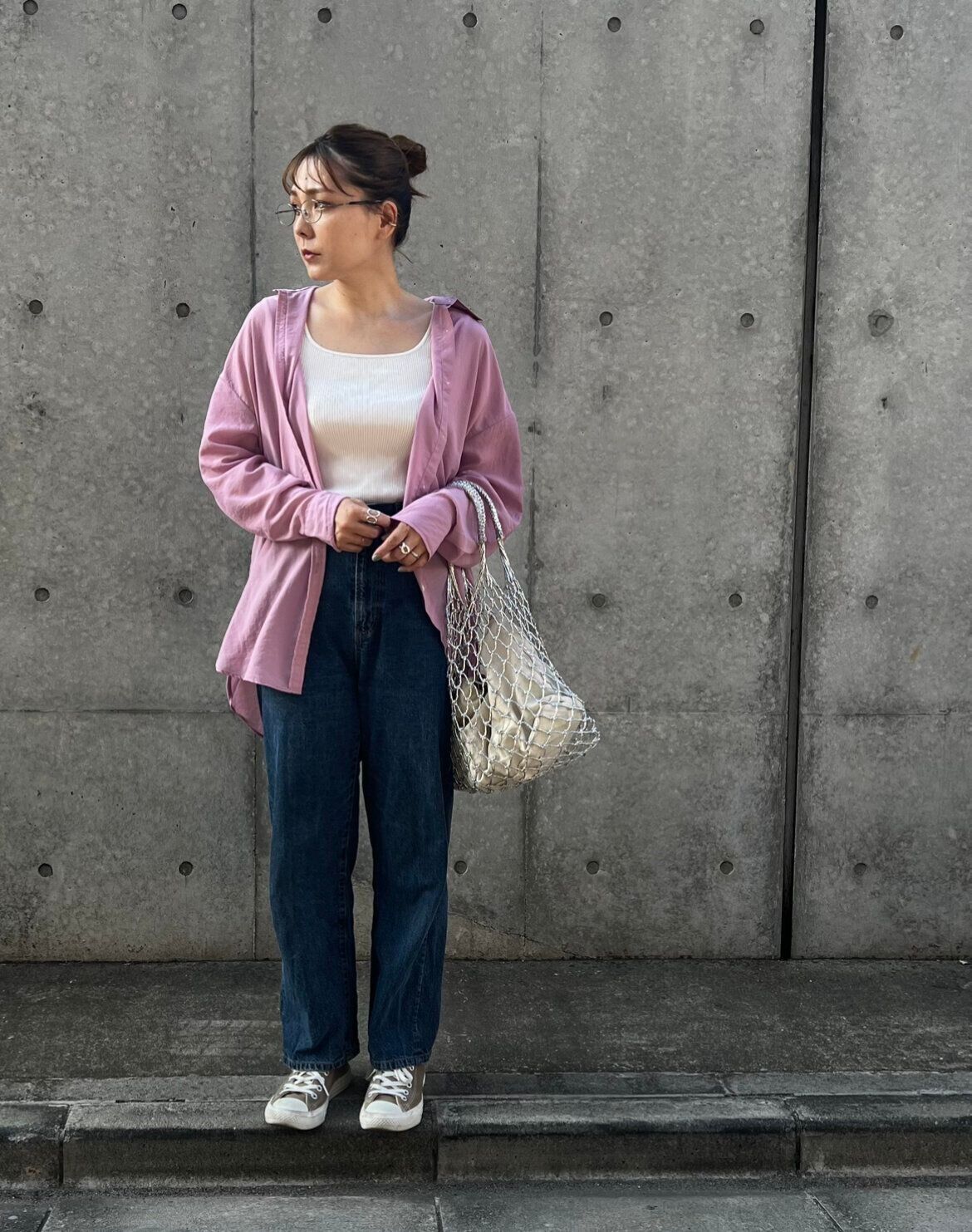 夏服にシャツをONするだけで、秋のスタイリングに、軽やかな素材のシャツを選ぶとそこまで暑くないのでおすすめです。