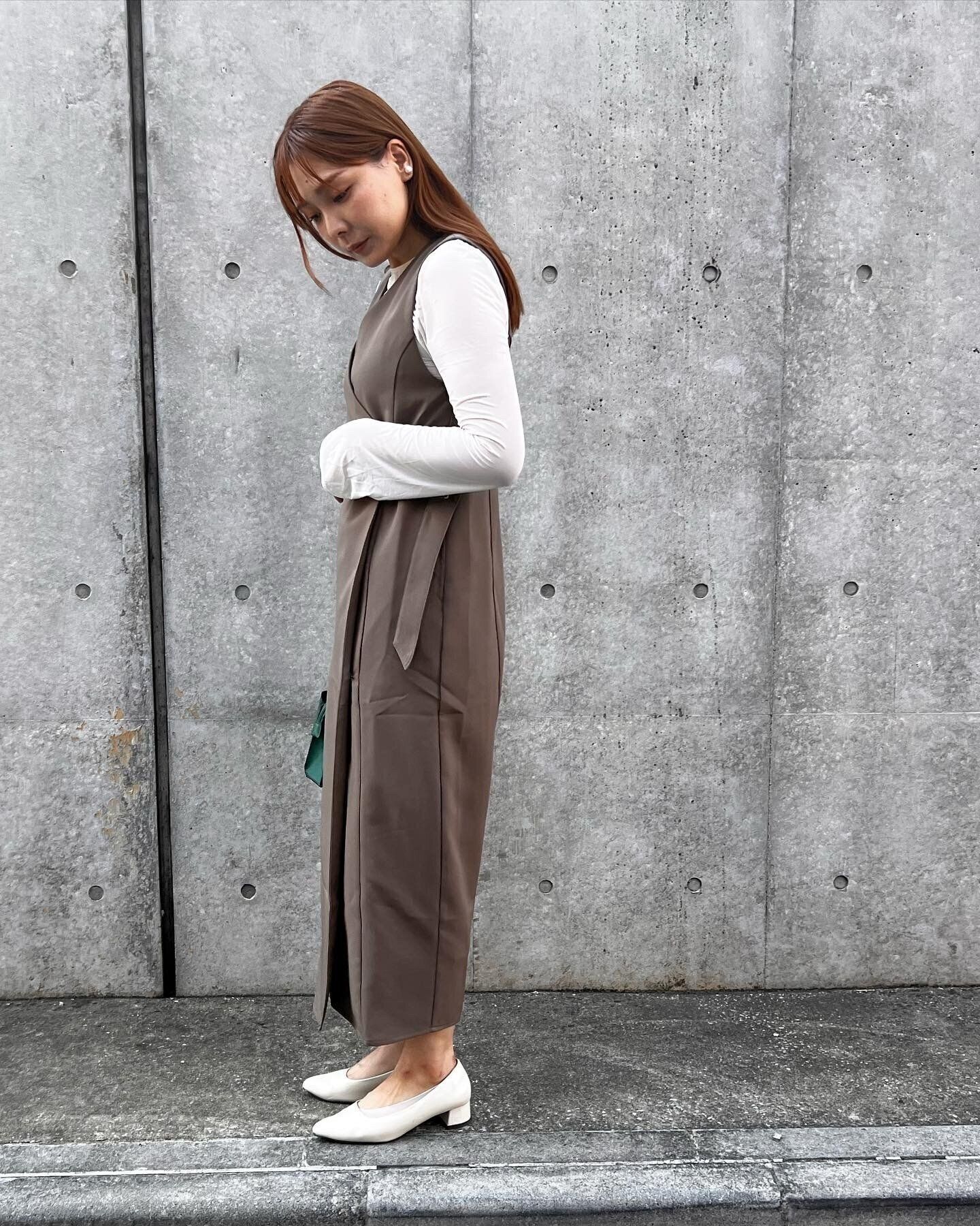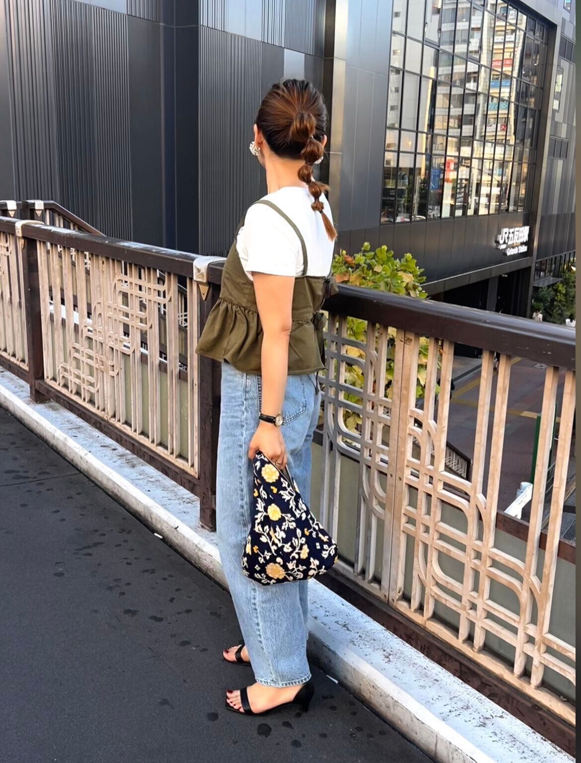 同じくアースカラーのビスチェを重ねています。一枚持っておくと季節関係なく手持ちのTシャツやワンピースに合わせて雰囲気を変えてくれる優秀アイテムです。