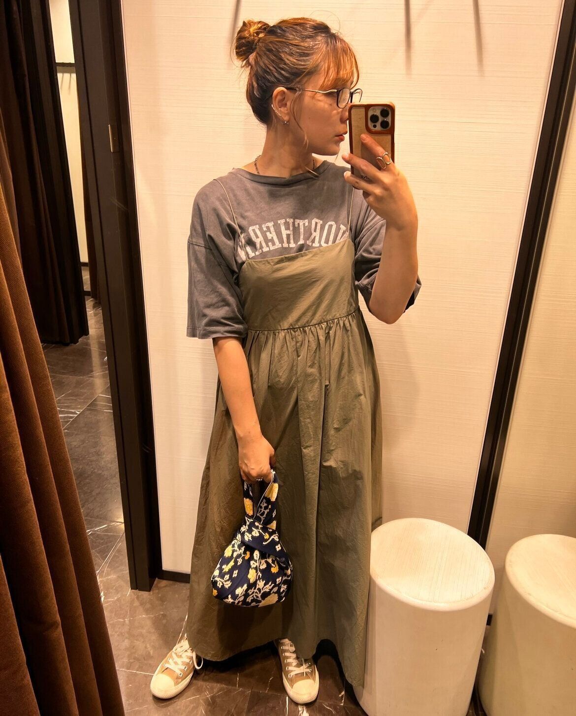甘めのキャミワンピもアースカラーを選べば大人女子でも使いやすい。さらにロゴTシャツやスニーカーなどカジュアル要素をミックスしました。バッグはニット素材のものを合わせてここでも秋らしさをプラスしています。