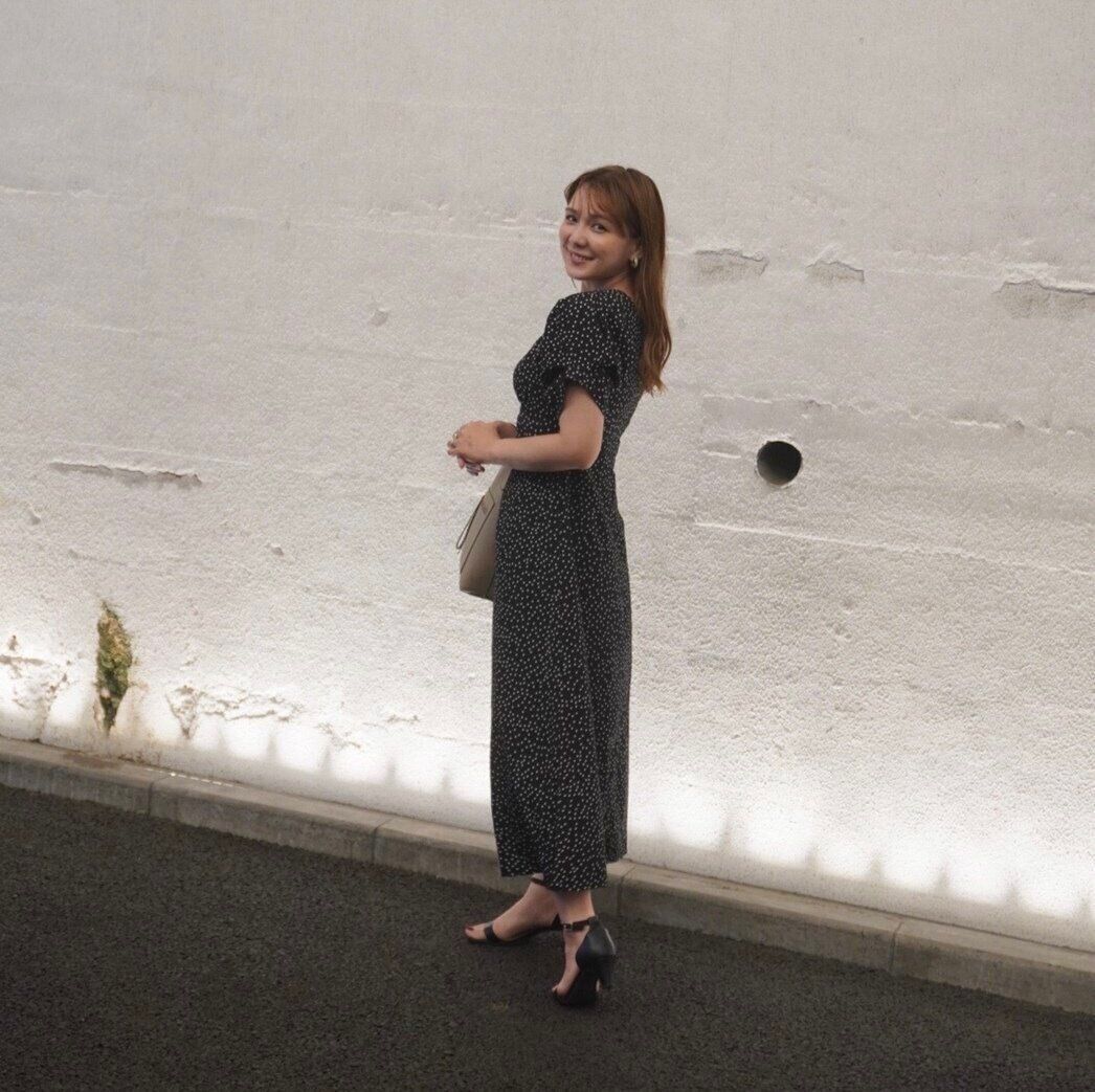ドット柄のワンピースでレトロなコーディネート。二の腕をカバーしたい人はパフスリーブを選ぶと余白が生まれて細見え効果があるのでおすすめです。