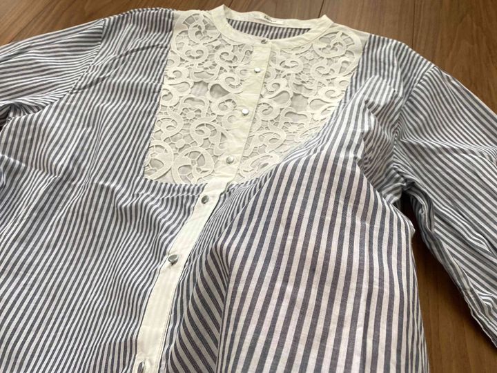 胸元にレース生地があしらわれた七分袖のストライプシャツです。
