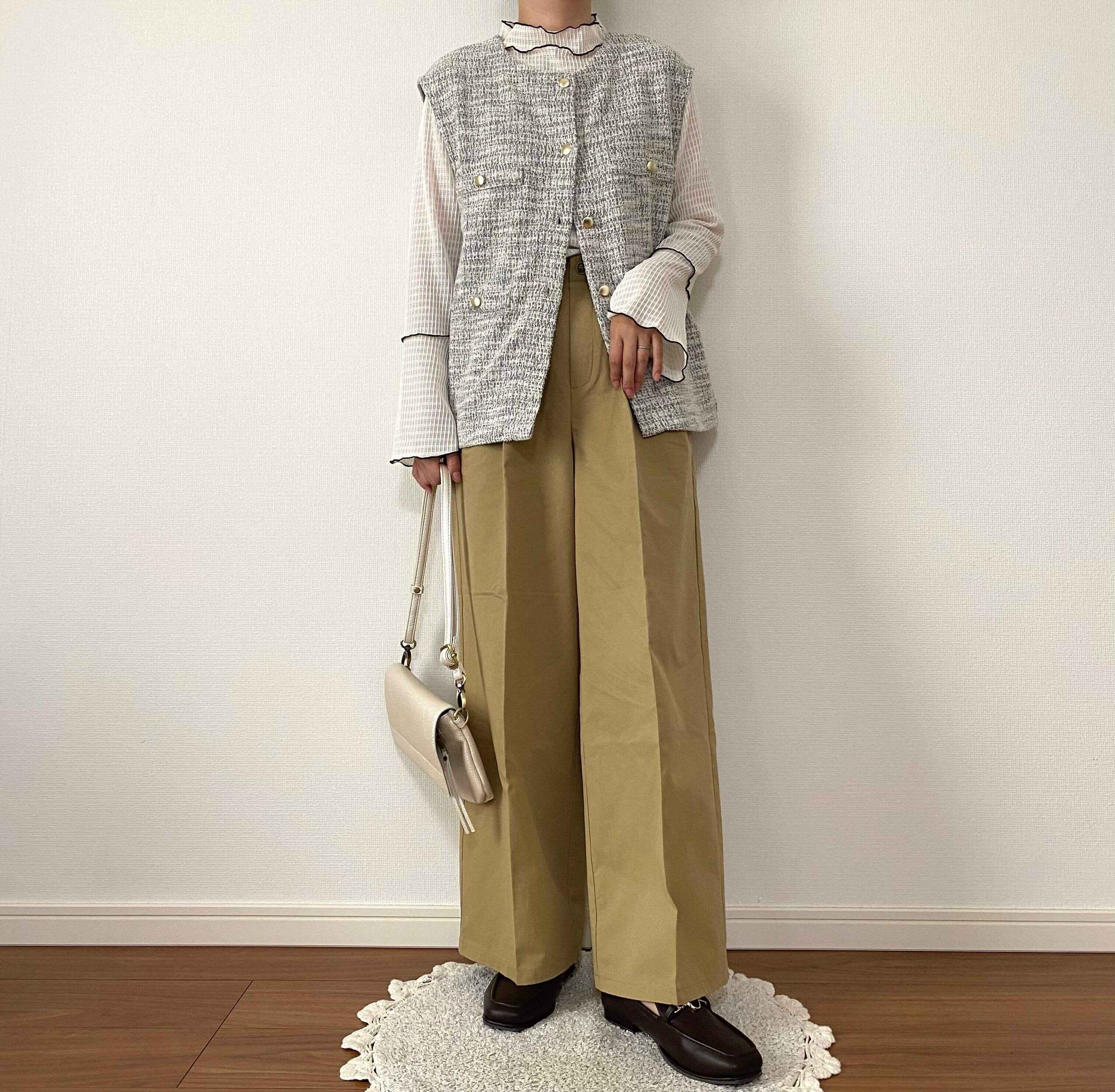 バイカラーのシアートップスにトレンド感のあるツイードベストを羽織った秋らしいコーデにしてみました!