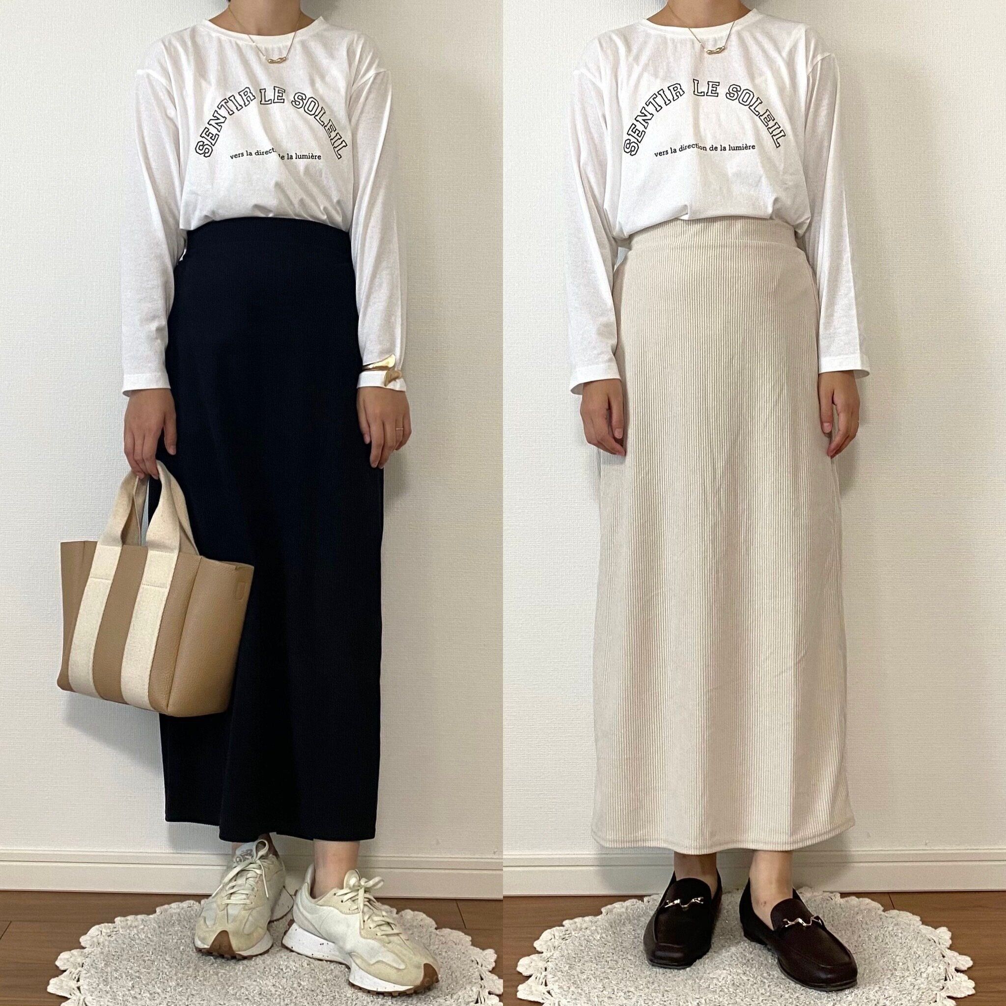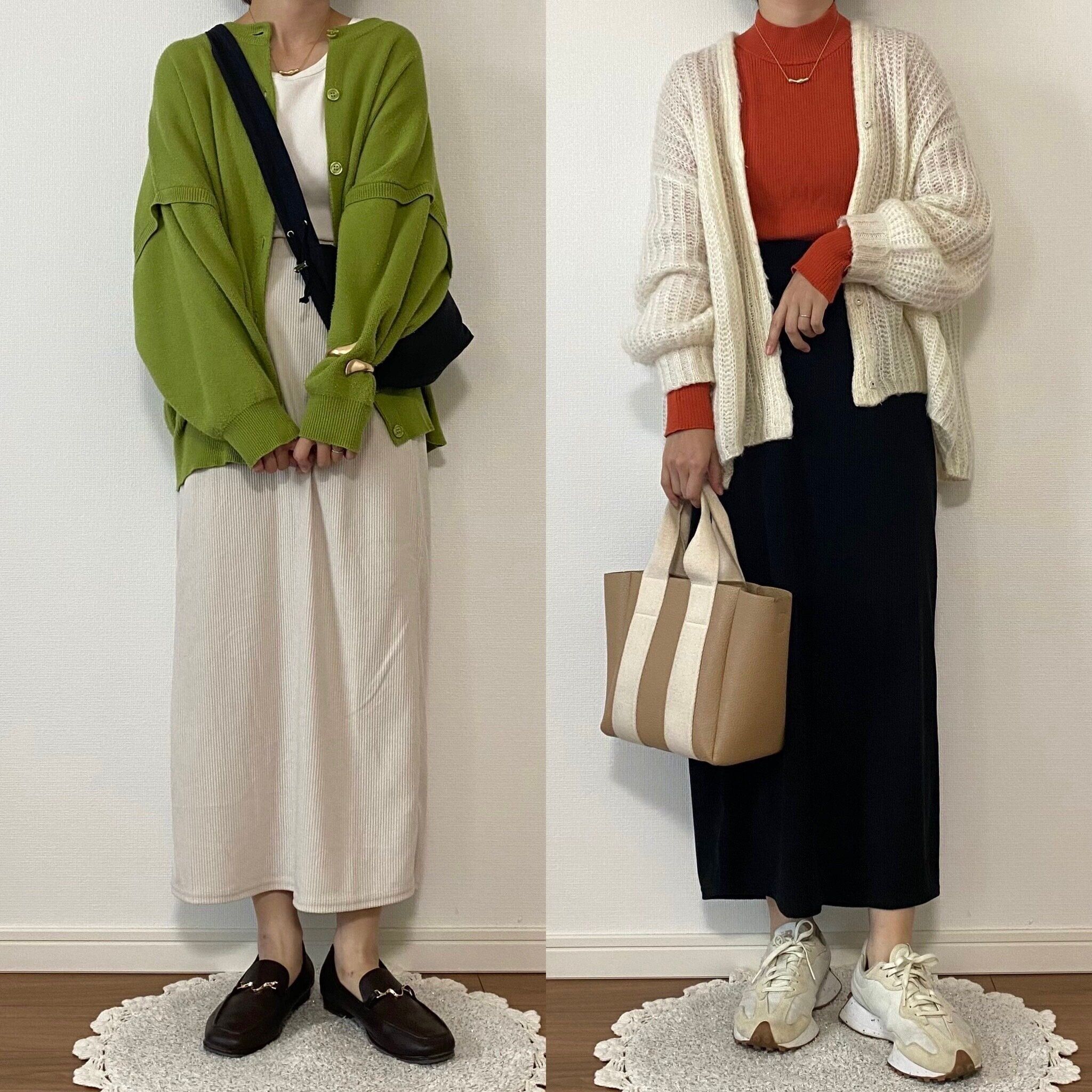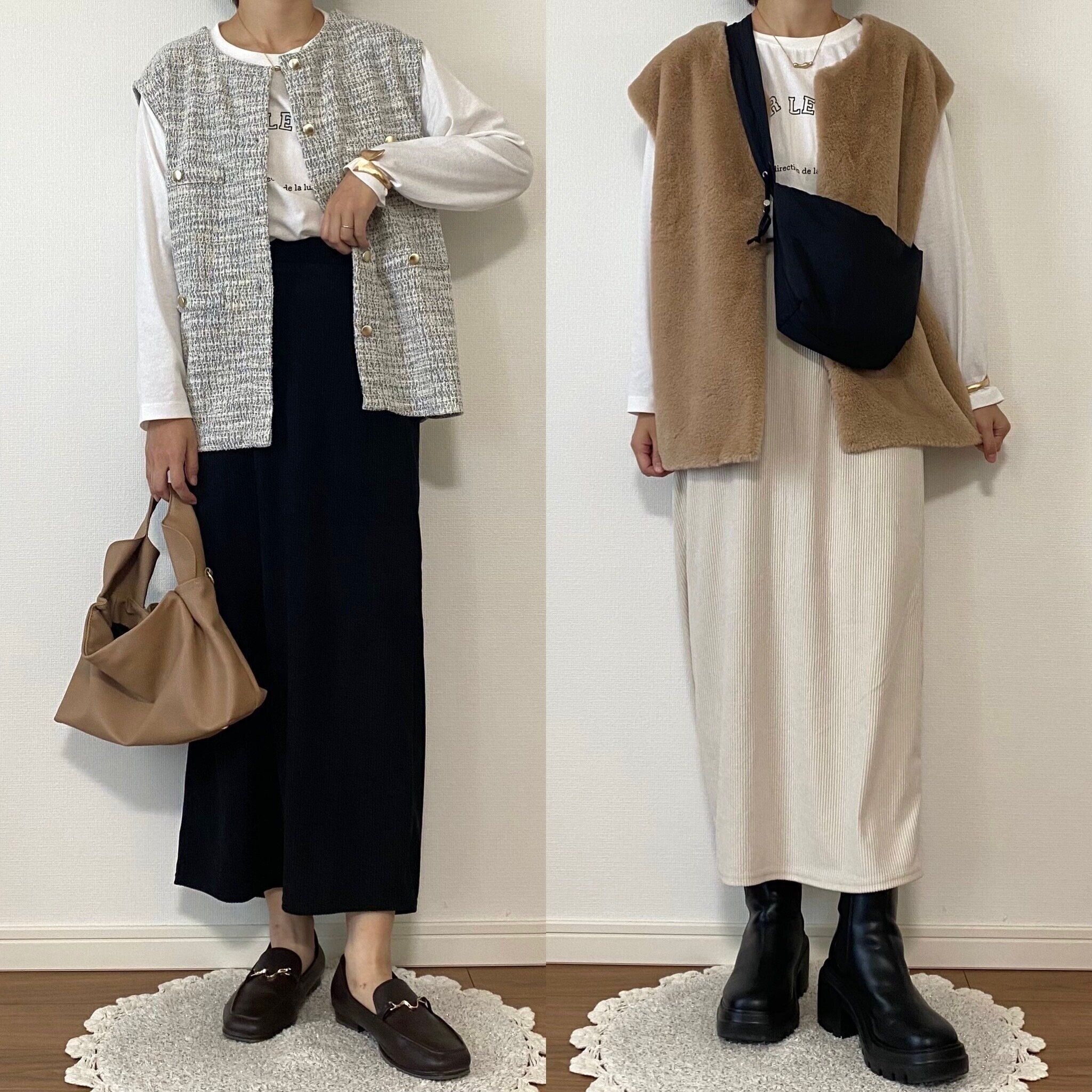 ブラックはツイードのジレで綺麗めに、ベージュはファーベストでかわいらしい印象のコーデにしてみました!