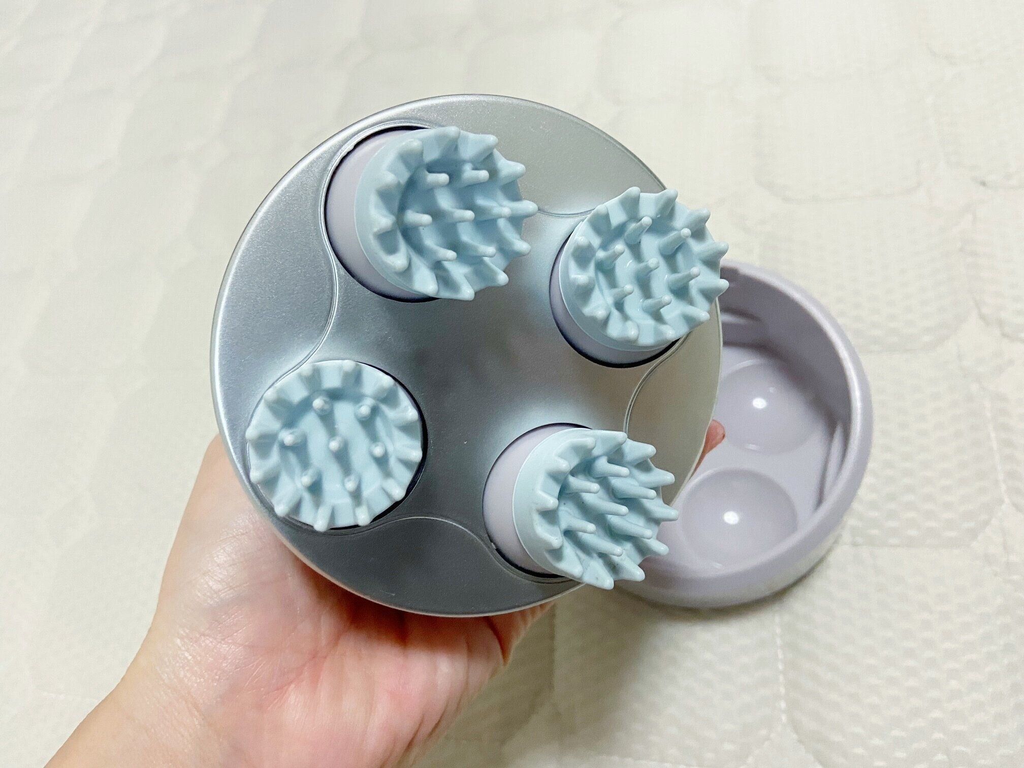 実際に使用してみた感想なのですが、シリコンヘッドはやわらかいので痛くありません。髪の毛がからまることもありません。筆者は頭皮がかなり凝っていているので、パワーが強いという感覚はありませんでしたが、マメに使うことでもみほぐされていると感じることができるようになっています。使用中の音は思った以上……というのが正直な感想です。