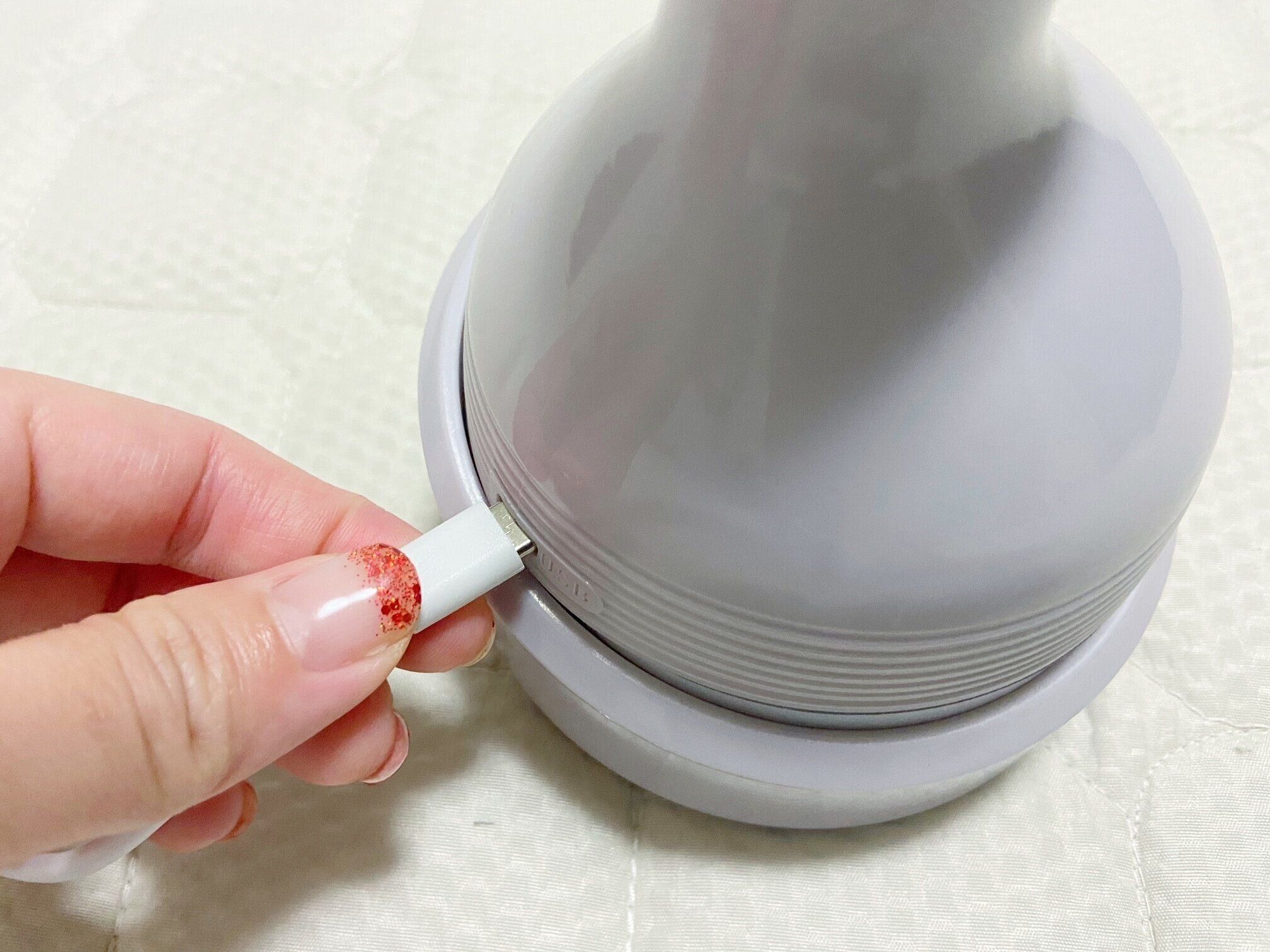 【and us】ヘッドケアマシンは充電式。充電用のUSBケーブルもセットになっています。充電しておけば使いたい時に使いたい場所で使用できます。筆者は就寝前にテレビを見ながら使用することが多いです。
