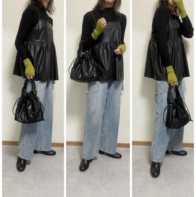 デニムにベーシックカラーのニットとシンプルなコーディネートもフェイクレザーキャミソールをプラスすることでワンランク上のカジュアルファッションが完成します。ファッションにプラスすることで、コーディネートの印象を変えることができるフェイクレザーキャミソールはファッションの幅を広げてくれる優秀アイテム。