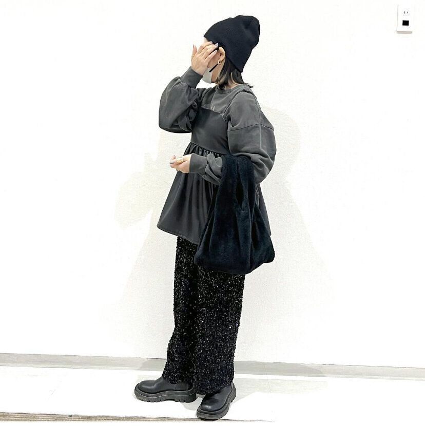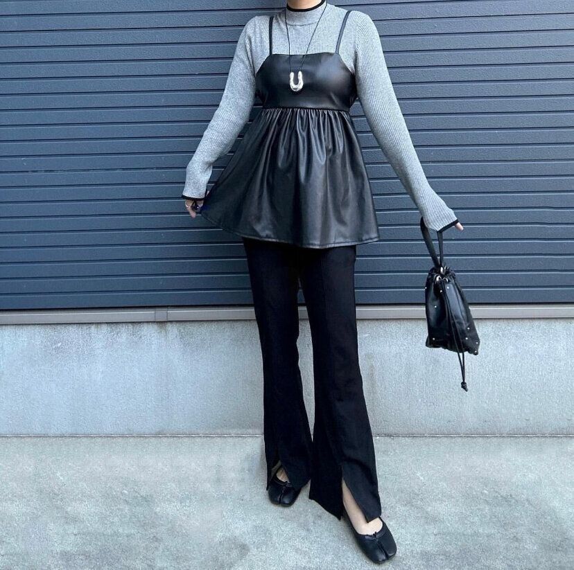 ブラックでまとめたコーディネートも、フェイクレザーやスパンコール・スウェットなど素材の違うアイテムをミックスさせることでおしゃれ上級者の印象を与えてくれます。「ゴウヒペプラムビスチェ」を加えることで、よりメリハリのあるファッションが完成!