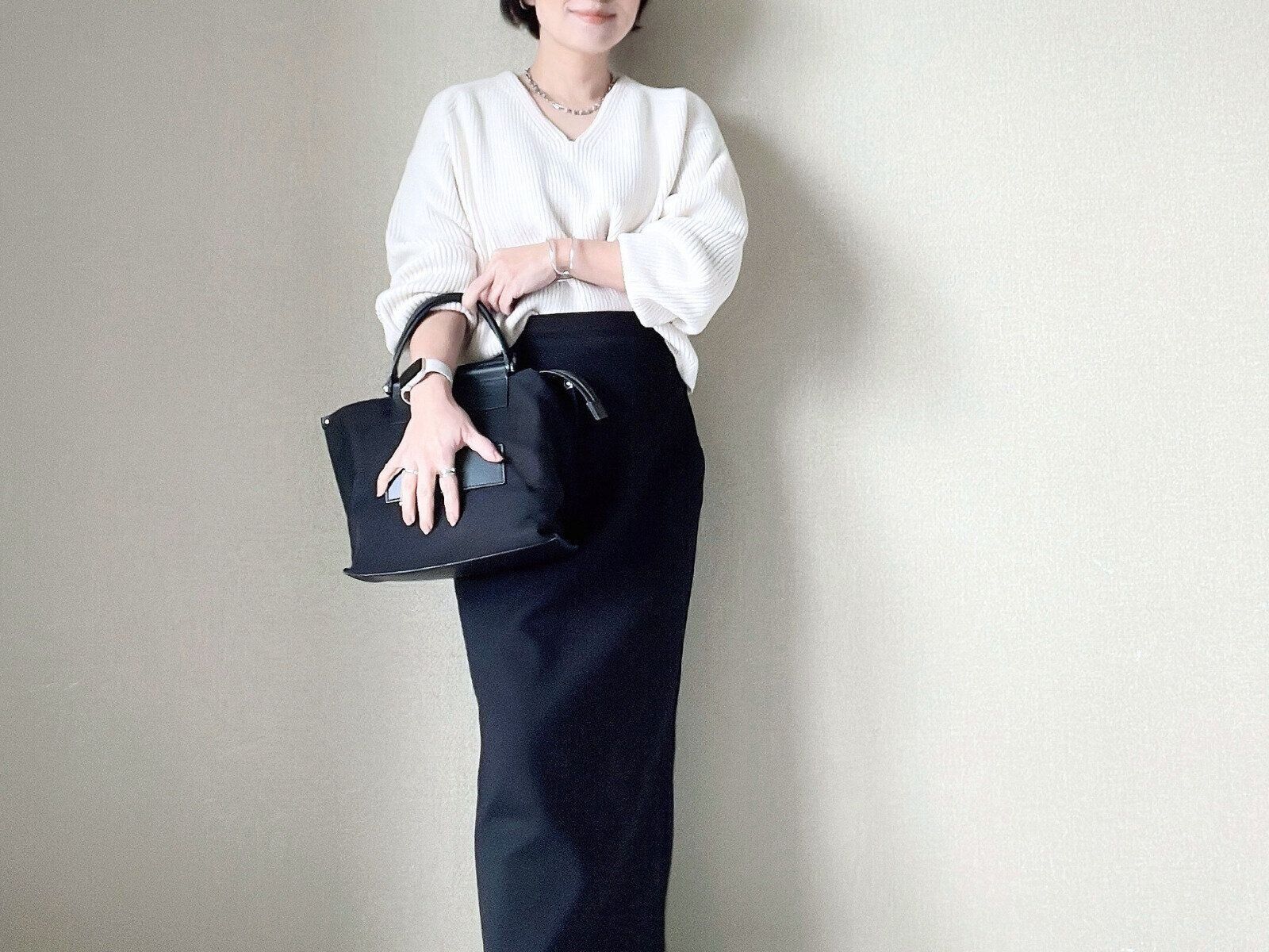 「ドレープデニムタックパンツ」「プレミアムラムボリュームセーター」「ラウンドミニショルダーバッグ」とユニクロで揃うアイテムでコーディネートしてみました。シンプルなデザインなので、コーディネートも簡単に組むことができました。黒いバッグだったので靴も黒で統一しています。