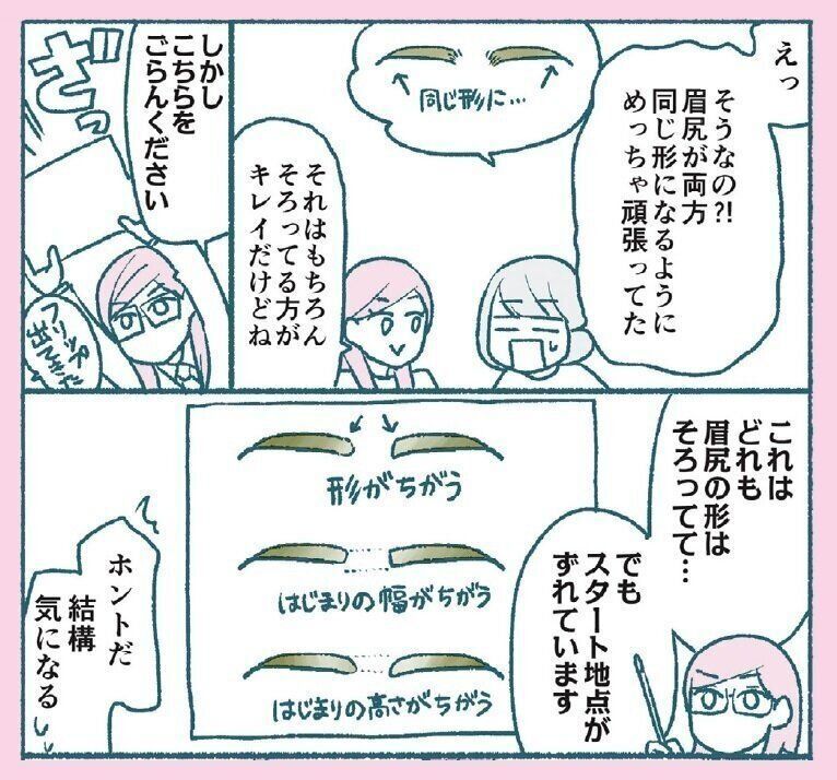 眉尻よりも眉頭を左右対称に描くのが最重要。左右の「形(丸みがある、角ばっているなど)」、「幅(太さ)」、「高さ」が揃うように描きましょう。