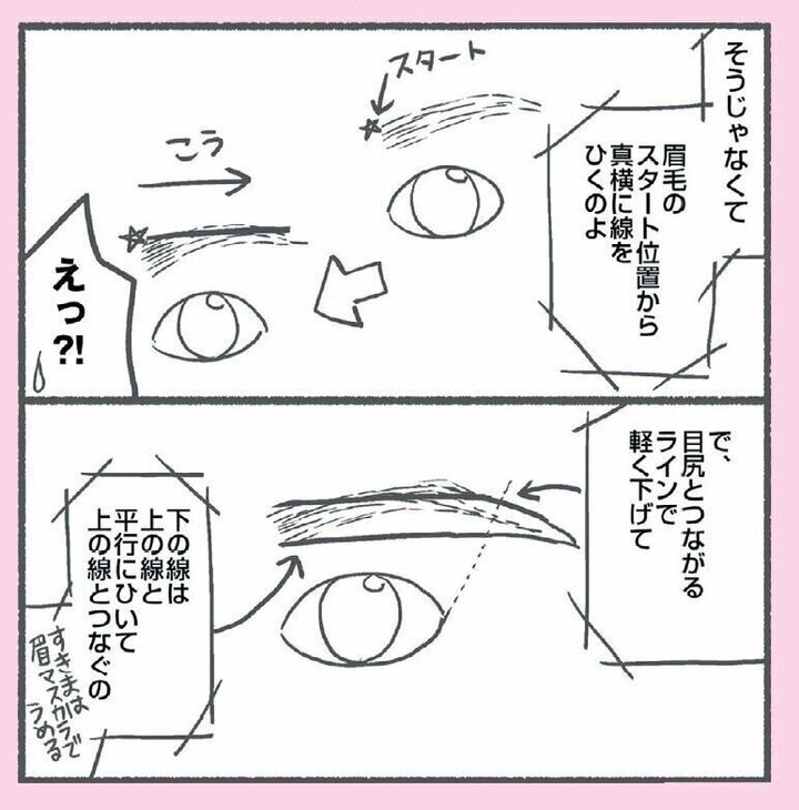 「元々の毛の生え方は無視して、眉頭から真横に線を引いて平行に仕上げましょう。その形からはみ出す部分の毛はカットし、生えていない所を描き足すのが正解。大切なのは自然に毛が生えているように見せること。のっぺりしないようにグラデを意識!」。