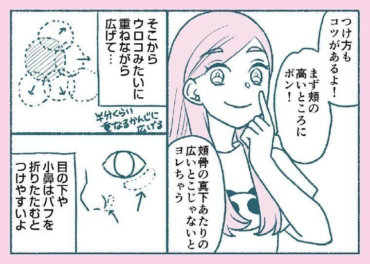 「つけるときのポイントは、液の量を取りすぎないこと。スポンジ全体にうーっすらファンデがついているくらいの量に調整し、まずは頬の一番高い所にポンとつけてから、周囲に広げていきます。厚塗りは崩れる原因に」。