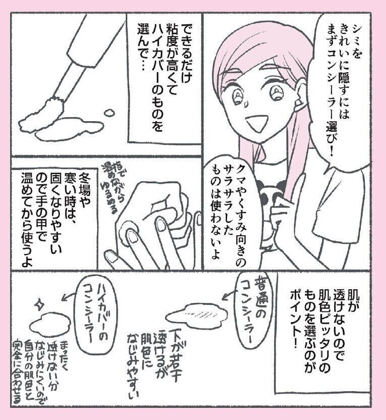 シミ用コンシーラーは、「肌色に合うこと」、「粘度が高く、塗った所に留まること」が大切。店頭のサンプルでチェックして買うのが正解。