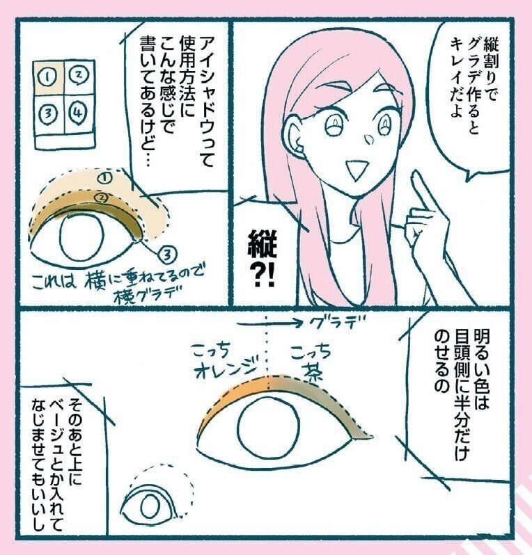 「コスメのパッケージにはあまり書かれていないけれど、簡単で印象的な目元を作れるのが『縦割りグラデ』。目頭側に明るい色、目尻側に暗い色をふんわりぼかすように入れるだけで完成。色の組み合わせで遊ぶのもおすすめ!」。