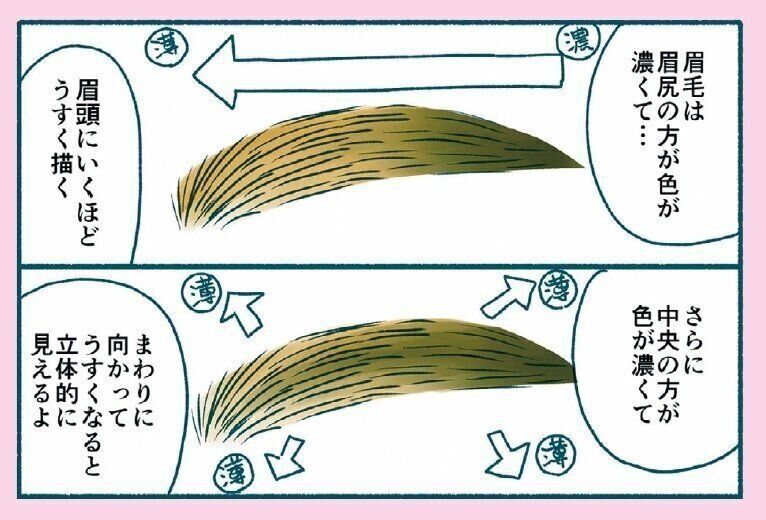 形は元の毛を無視してOK。「眉頭はうすく、眉尻は濃く。グラデにすると自然ですね」(井ノ浦さん)。