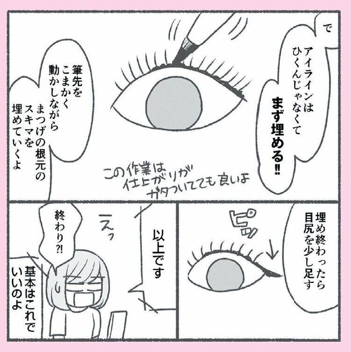 まつげの根元のすき間を埋めるだけ。「線は引かなくていいのは楽!これなら失敗しませんね」(井ノ浦さん)。