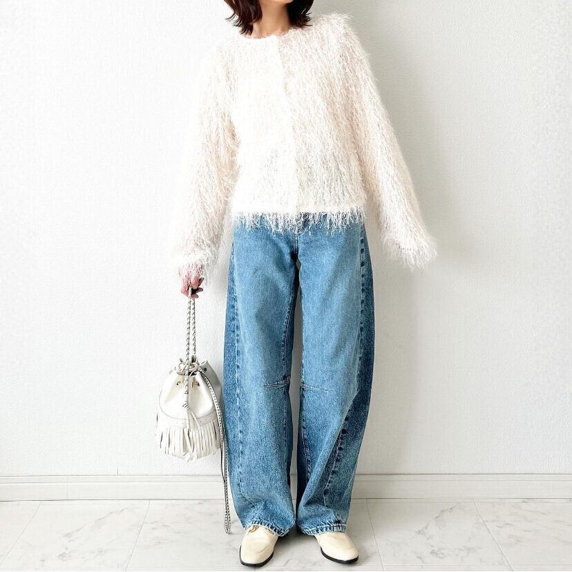 股上が深いジーンズなのでルーズすぎないトップスを合わせることでシルエットにメリハリが出てよりスタイルアップした印象に仕上がります。