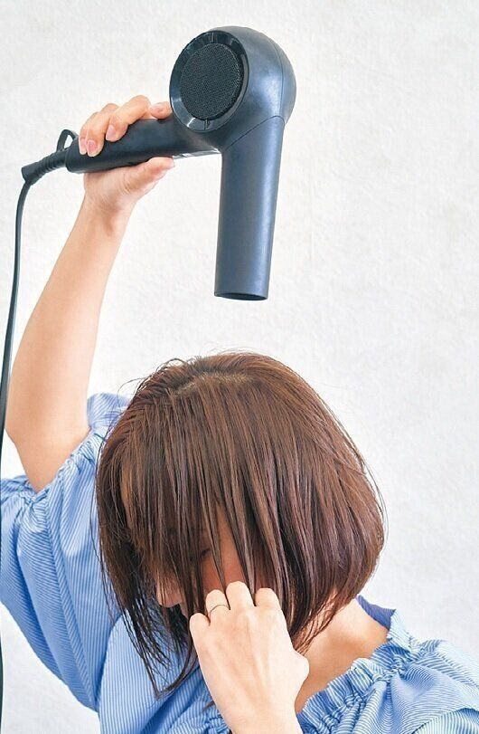 毛流れとキューティクルを整えるために、上から風をあてて乾かす。少し下を向くと毛先が自然と内巻きに。