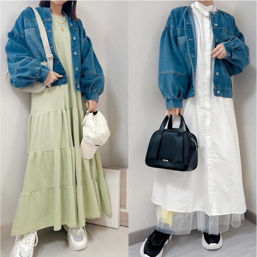 「デニムノーカラーJKT」はアウター選びがむずかしいロング丈のワンピースにもピッタリ。短めの丈感のアウターなので、ティアードスカートやチュールスカートなどボリュームのあるボトムスでもコーディネートがバランスよく仕上がります。ポワン袖は、おしゃれなだけでなく、重ね着しても窮屈にならないので着心地もバッチリ!