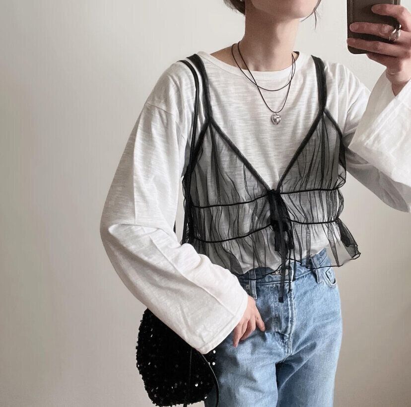 チュールビスチェとセットになっているロンTを合わせればOKなので、コーディネートを考えるのが苦手な人も取り入れやすいですよ。デニムなど手持ちのアイテムでもトレンド感あふれるコーディネートが完成します。