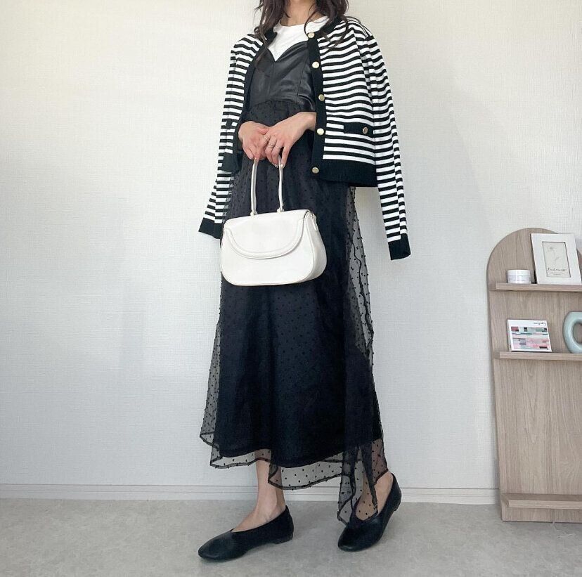 色違いのブラックは同じデザインでもシックな印象。チュールやドット柄などかわいらしい印象のアイテムを取り入れるのには少し抵抗がある人でもワンカラーのブラックならチャレンジしやすいですよ。