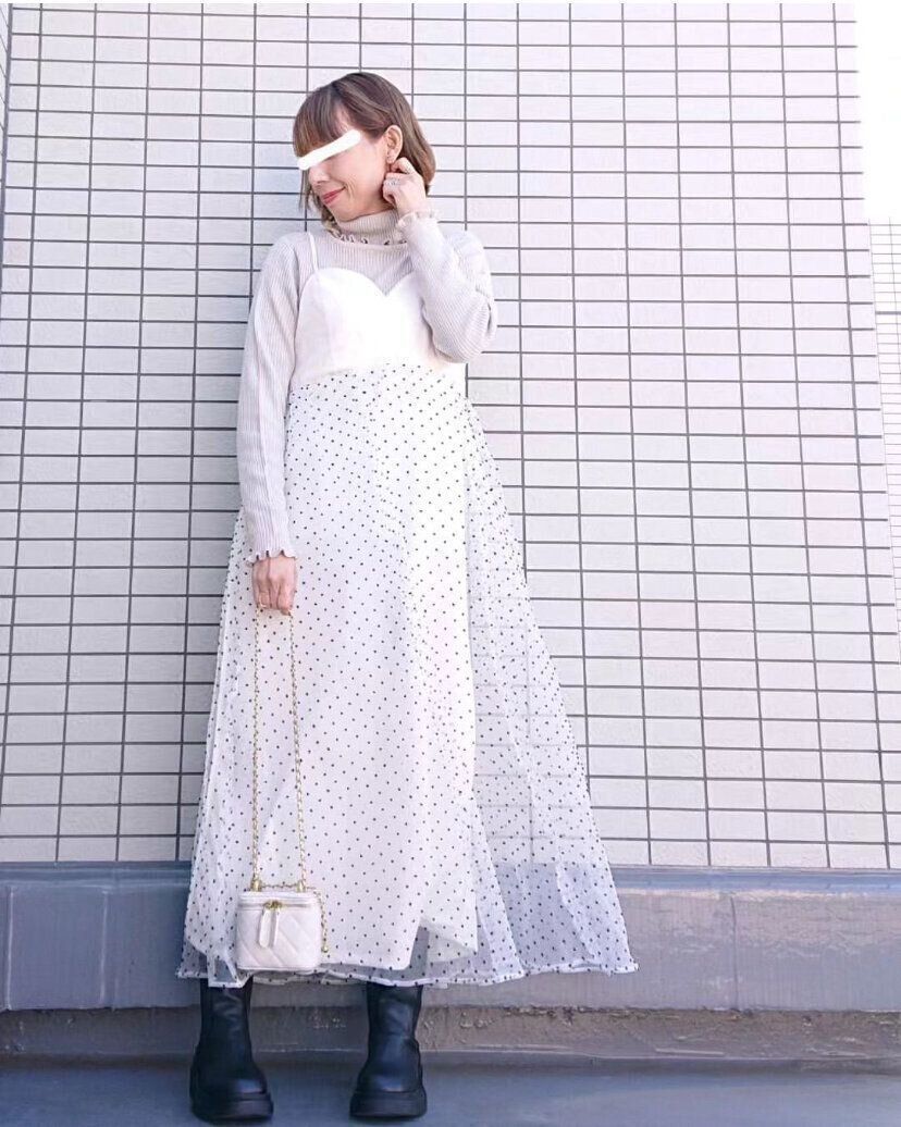 胸元はトレンドのレザー調の生地を採用、スカート部分はこの春注目の柄のドット柄をあしらったチュールを取り入れるなど1枚で春の流行がぎゅっと詰まったアイテムです。大人っぽく着用するならシンプルなモノトーン調でまとめるのがマスト。