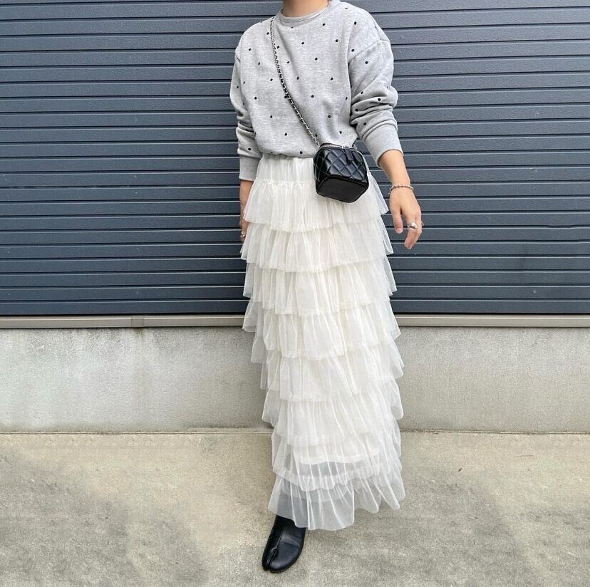 シンプルなスウェットやTシャツなどもデザイン性の高いチュールスカートを合わせれば雑誌のスナップに登場しそうなコーディネートに大変身!