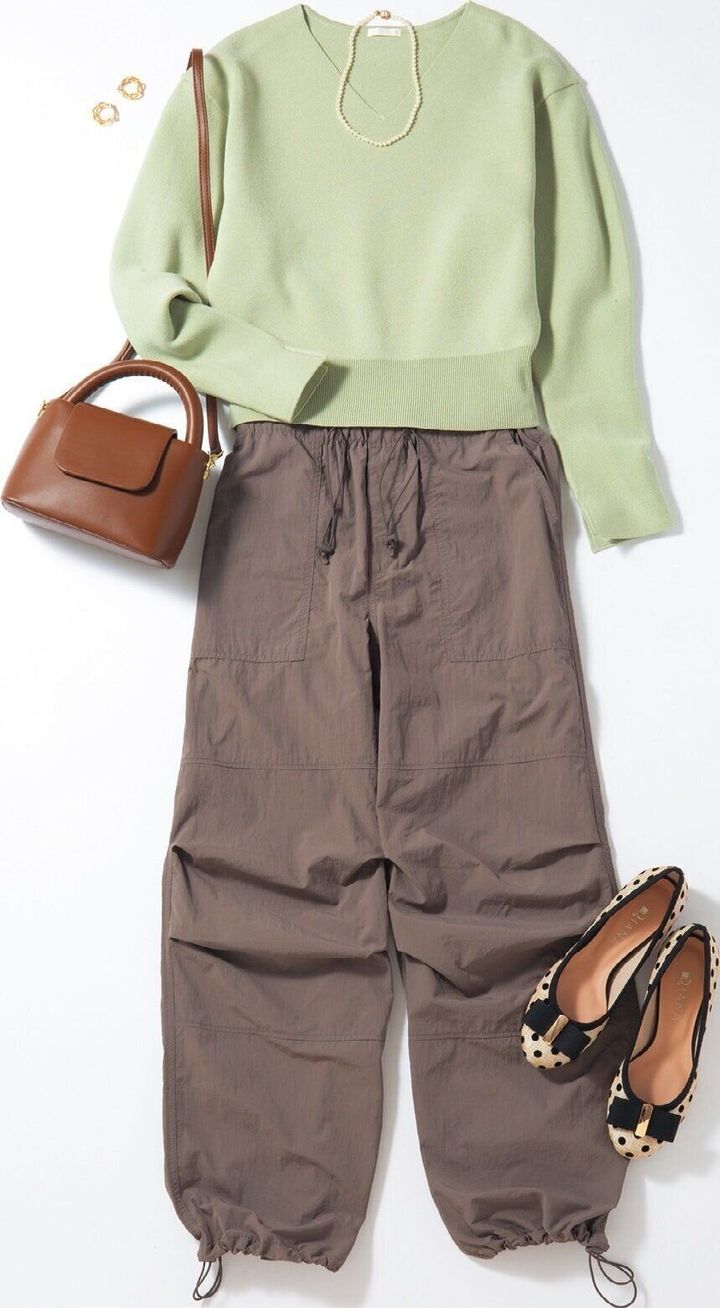 くすみカラーのパンツに、春色のニット、デザインパンプス、小ぶりのバッグを合わせて、カジュアルな中にも品のあるコーデに。