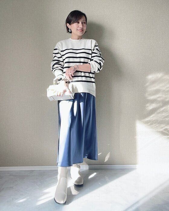 ボーダーは「カジュアル」なイメージがあるので、大人っぽく着たい人は光沢のあるものと合わせると、グンと大人っぽさが増しますね。