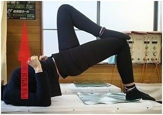 ゆっくりとお尻を持ち上げます。上の写真のように、背中から膝までがまっすぐになるように意識しながら行いましょう。その際、膝に乗せた一方の足で、体が浮かないように膝を押します。