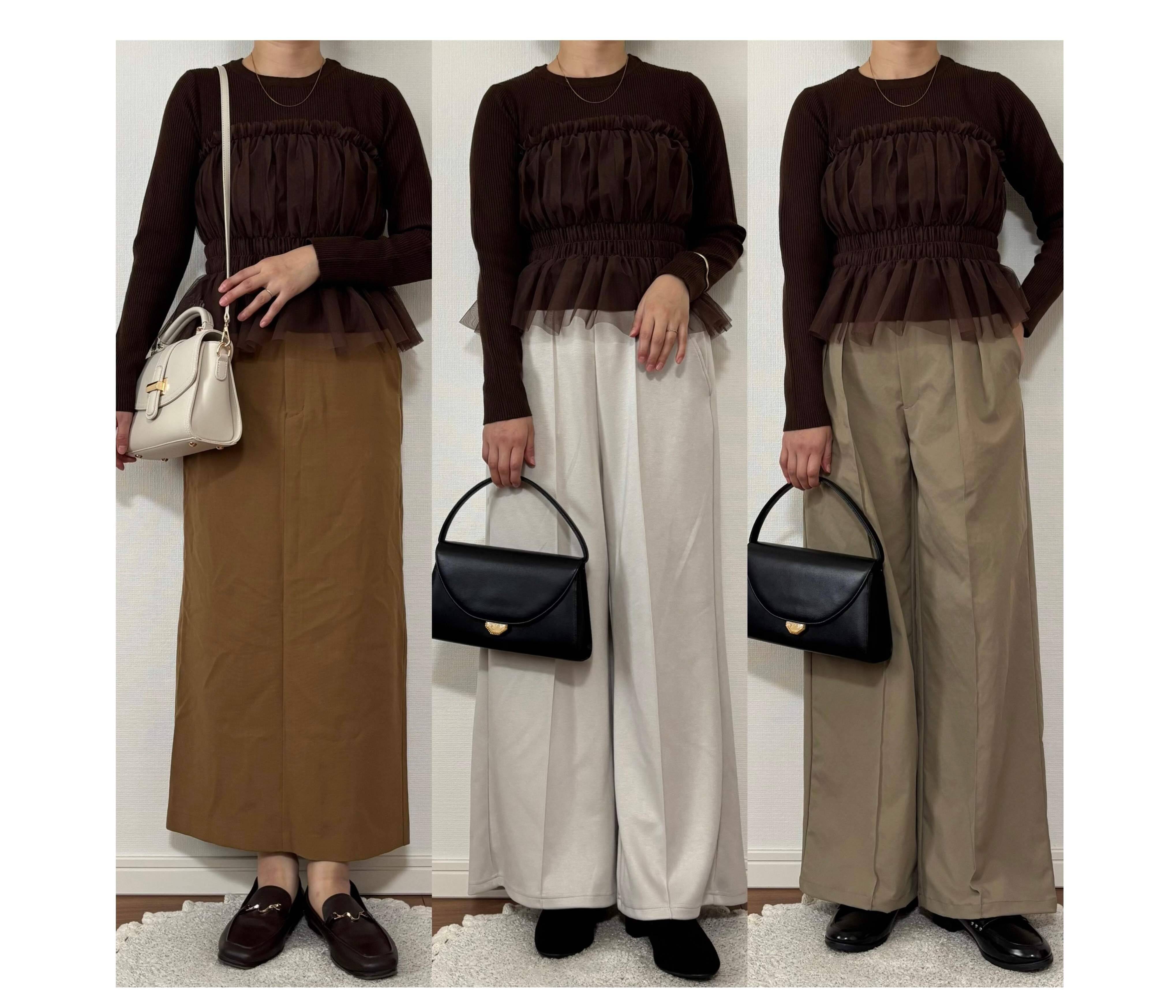 ドッキングされたチュールが華やかで存在感があるので、パンツスタイルでシンプルにコーディネートしても垢抜けた印象になります。