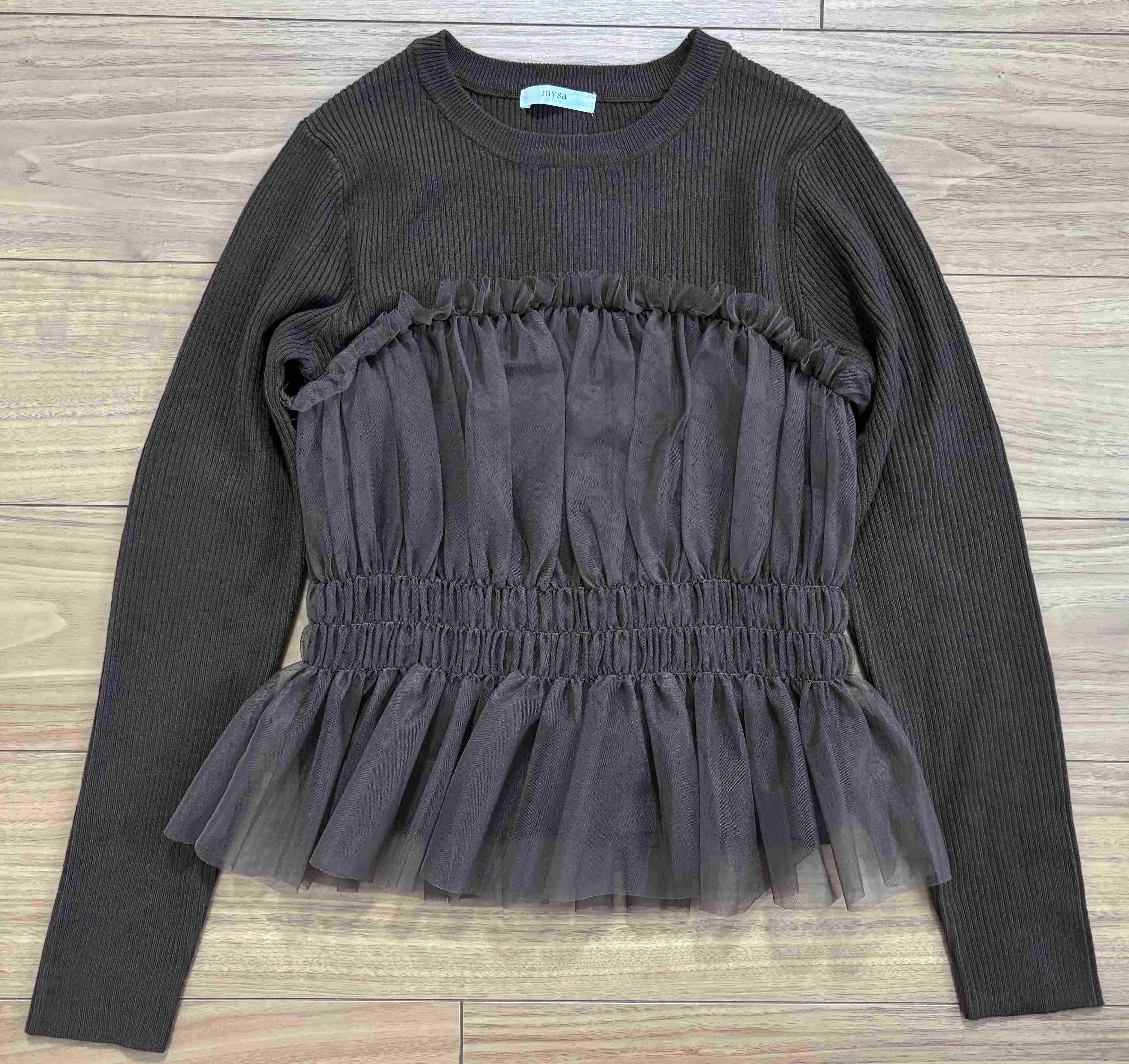 細身のリブニットにふわふわのシアーチュールが縫い付けられたトップスです。