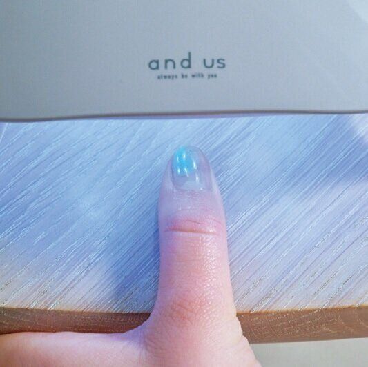 ターコイズがかわいいAを爪全体に塗り、UVライトを当てる。好みの濃さになるまで「塗る→ライトで硬化」を繰り返す。