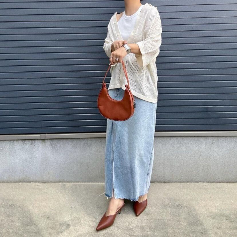 シンプルなデニムスカートにウォッシャブルメッシュニットシャツを合わせることで抜け感のあるレディライクな印象のコーディネートが完成します。メンズアイテムを女性らしく着用したいなら、スカートやヒールなどの華奢な印象の靴、デコルテなどのチラ見せなど組み合わせるアイテムを女度高めアイテムすればOK。