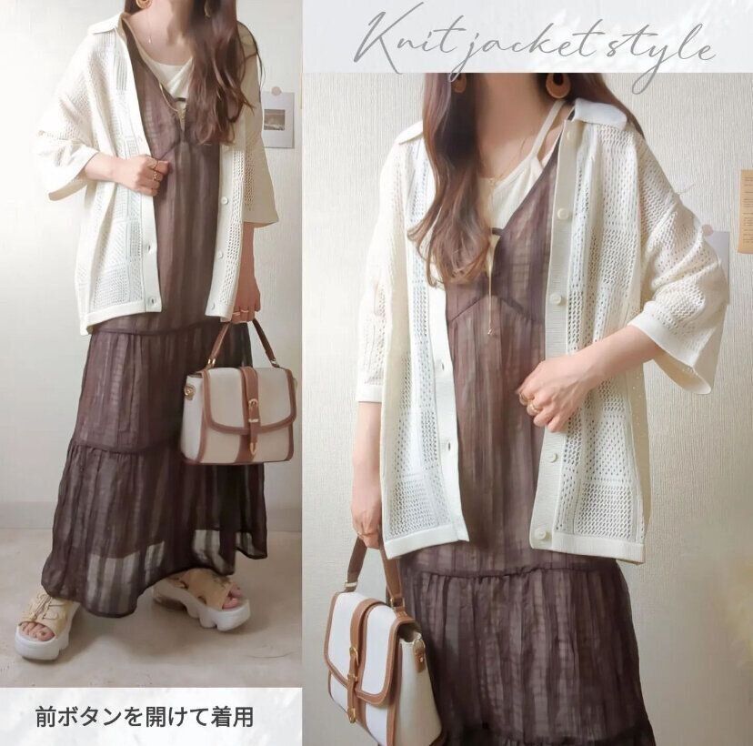ウォッシャブルメッシュニットシャツを羽織りとして着用するのもおすすめ。とくにアウターや羽織り選びがむずかしいワンピースと相性が抜群です。メンズアイテムだからこそのややルーズなシルエットが華奢な印象を与えてくれます。とくにオフホワイトはどんなカラーのアイテムでも合わせやすいので春夏のジャケットとしても大活躍してくれること間違いなしです。