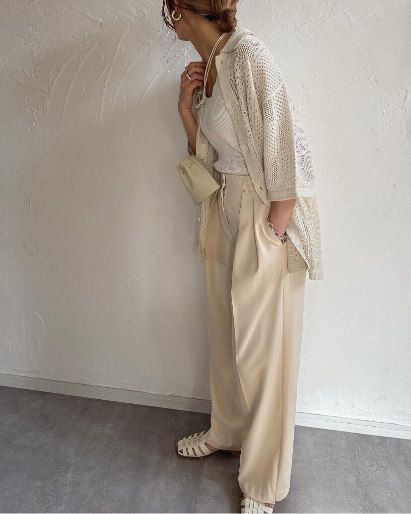 ワンカラーコーディネートもボトムスの素材感を変えると違った印象に。スラックスのような生地感のボトムスを選べば、カジュアルななかにもきっちり感をプラスしたハンサムコーディネートが完成します。あえてウォッシャブルメッシュニットシャツを羽織りのように着用して抜け感を演出することでより一層おしゃれに見えるテクニックはぜひマネしたい!