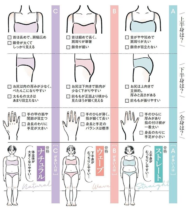 一生変わらないといわれる骨格タイプ。ストレート・ウェーブ・ナチュラルの骨格診断で、自分の骨格タイプと特徴を知ろう!骨格や筋肉がつきやすい場所は人によって違うので、自分はどのタイプか確認してみて。