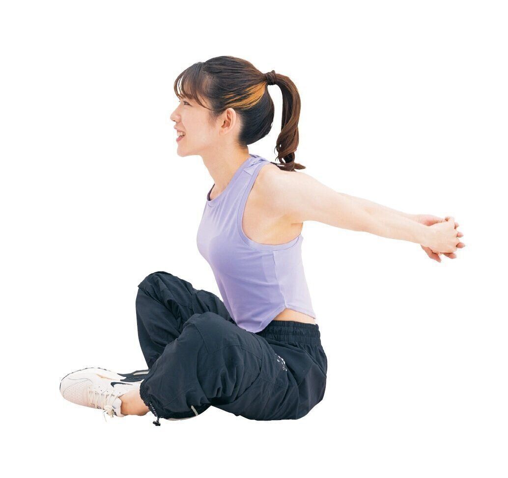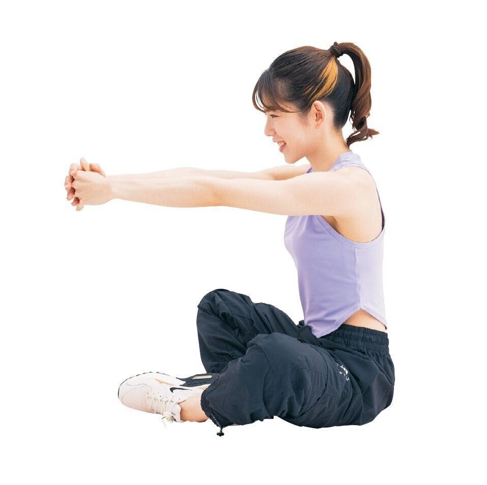 あぐらで座り、両手を前にゆっくり伸ばして手を組み、頭を軽く下げて10秒背中を丸くする。