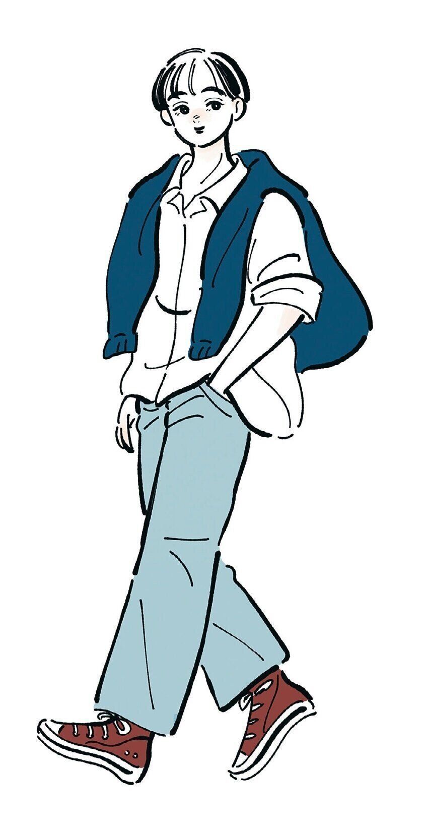骨や関節が目立つので、コンパクトなサイズの服よりも、ゆったりとしたカジュアルな服が◎。白シャツ×デニムのリラックスしたコーデで、体形をカバーしつつ、こなれた印象に。