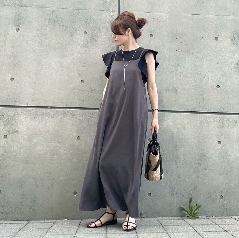 袖のフリルが印象的なので、肩紐の細いアイテムが相性抜群です。華奢なデザインのサンダルを合わせれば、カジュアルになりやすいキャミワンピースも大人っぽいスタイルに。黒のラッフルスリーブTはかわいらしくなりすぎないので大人カジュアルスタイルに重宝すること間違いなし。